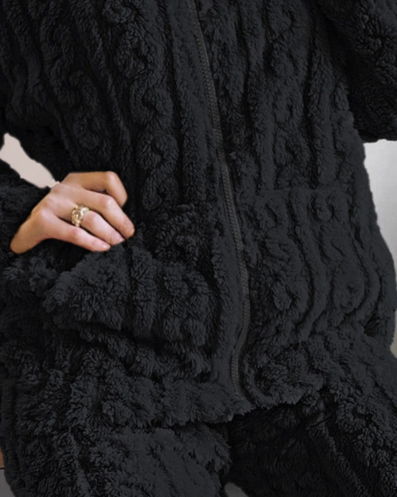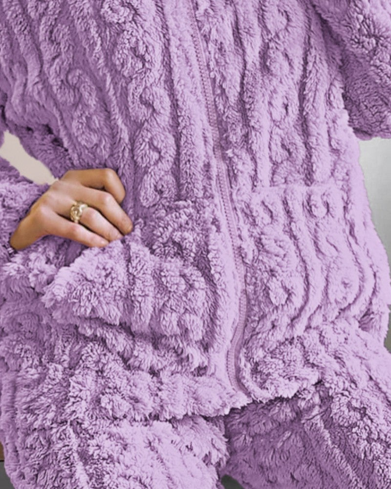 2PCS Jacquard Textured Stand Collar Zip Up Fuzzy Teddy Top & Pants Set