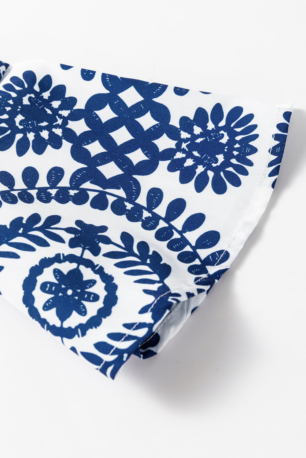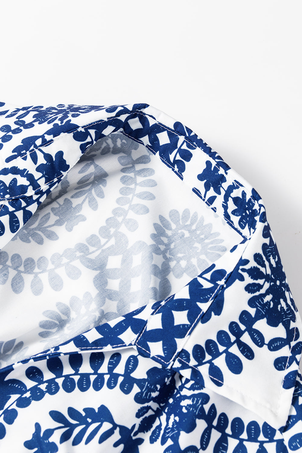 Blue Floral Print V Neck Wrapped Knot Long Sleeve Dress