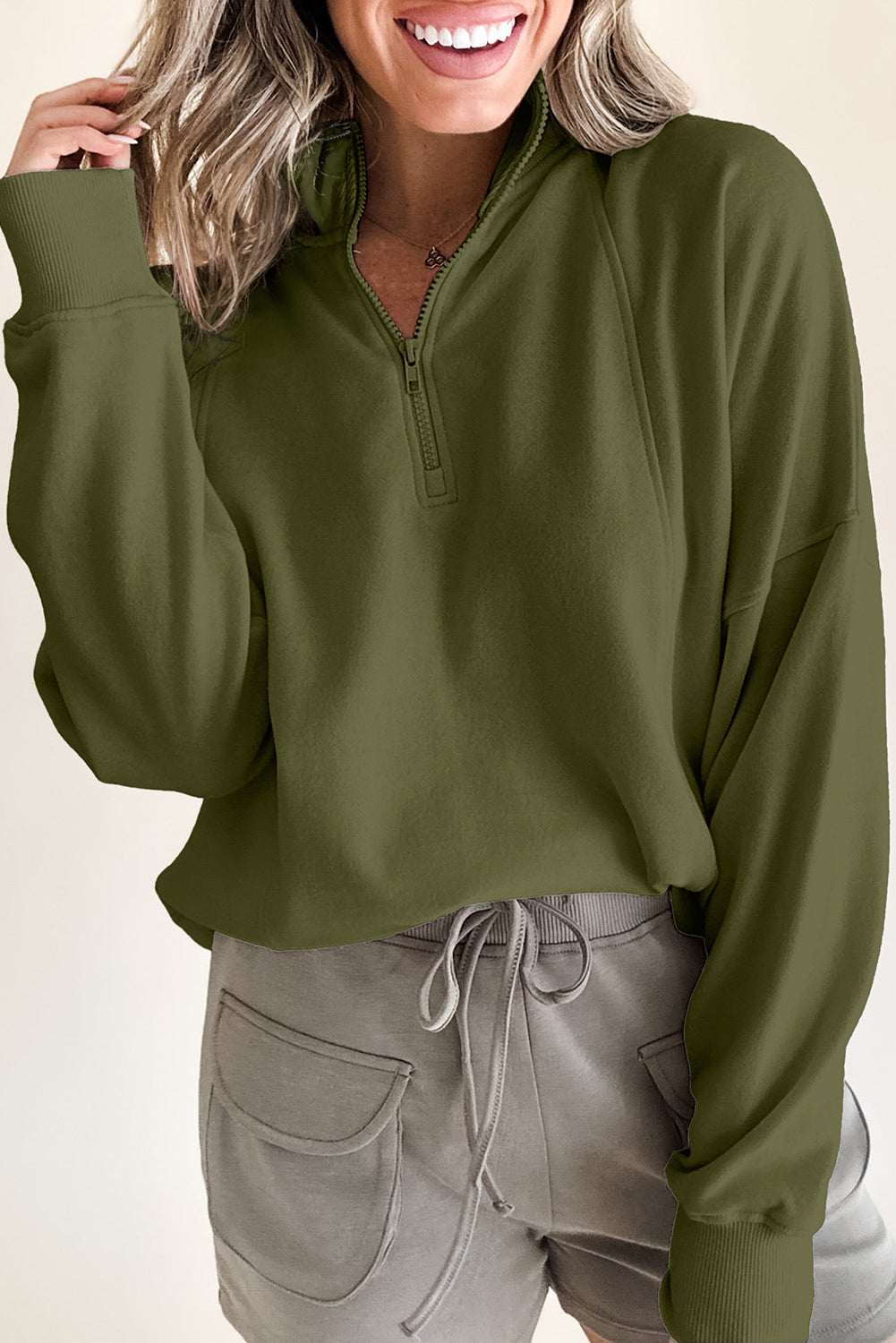 Black Zipped Neck Pullover Drop Shoulder Sweatshirt