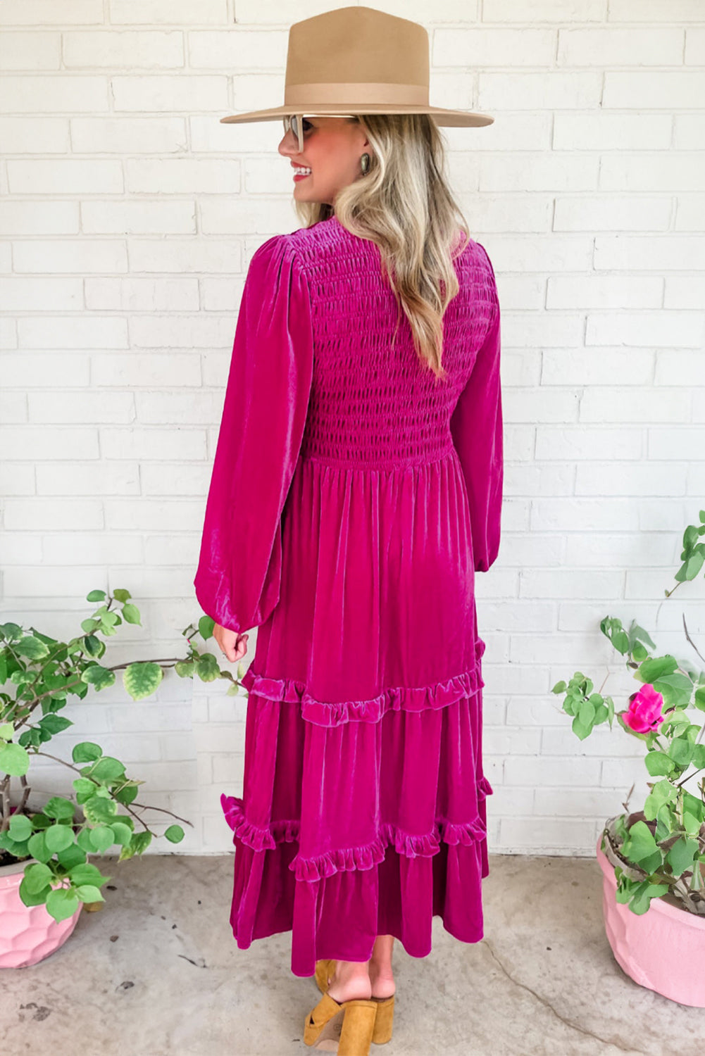 Rose Red Shirred V Neck Tiered Ruffled Velvet Plus Size Maxi Dress