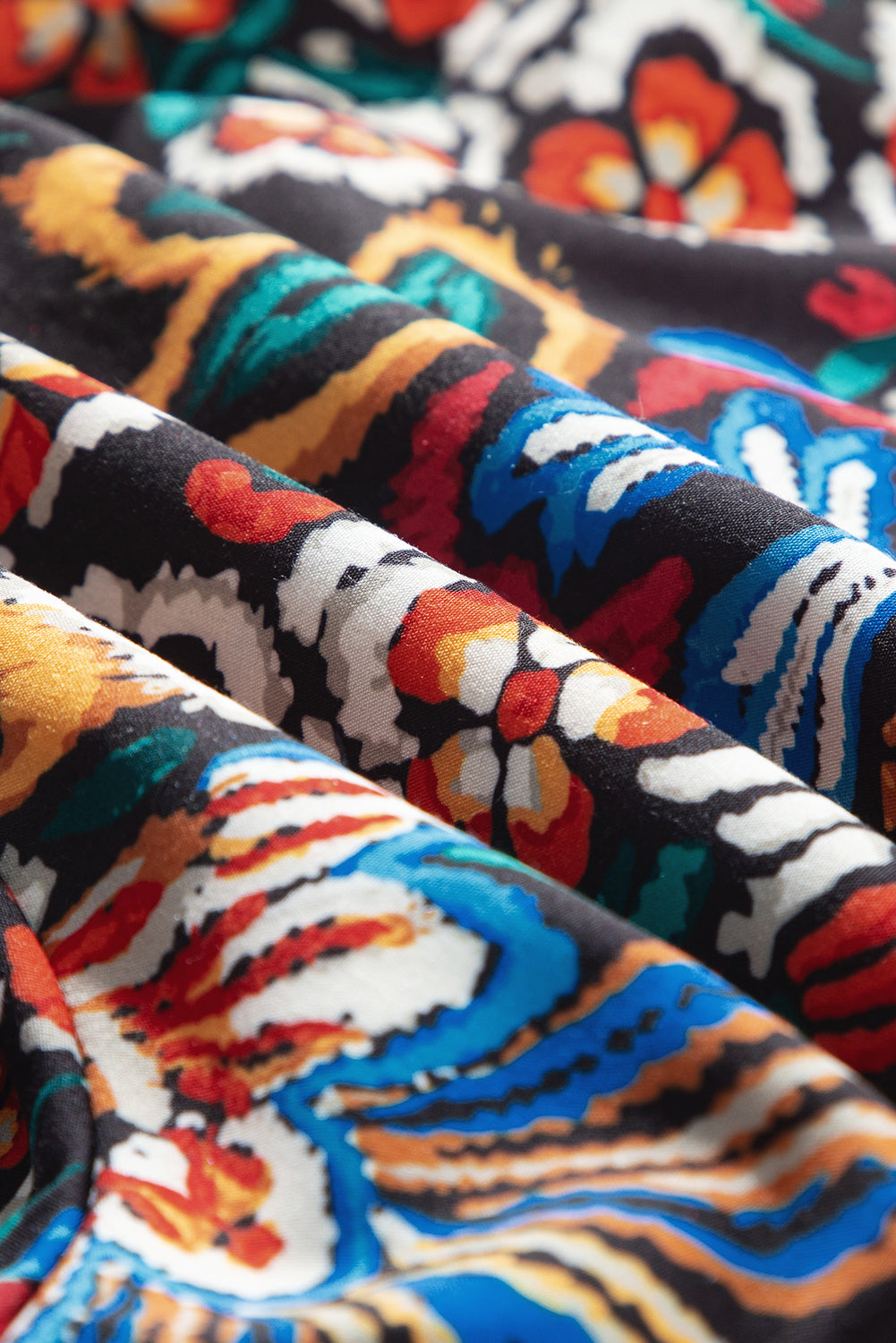 Black Tropical Print Bubble Sleeve Knot Front Blouse