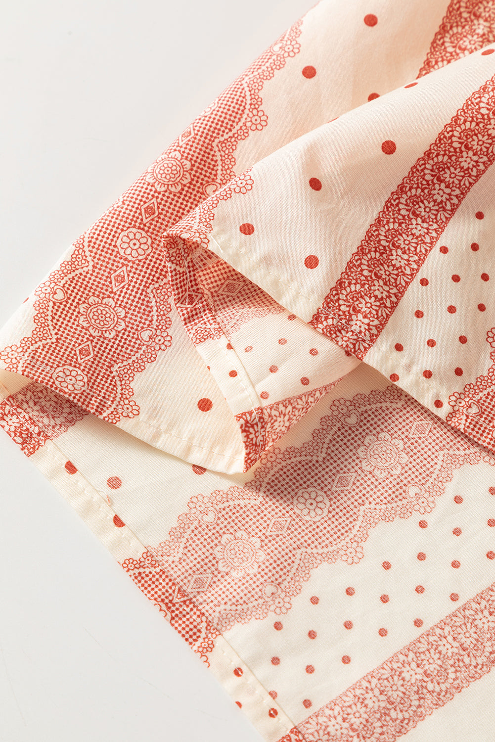 Red Frilled Short Puff Sleeve Mixed Print Blouse