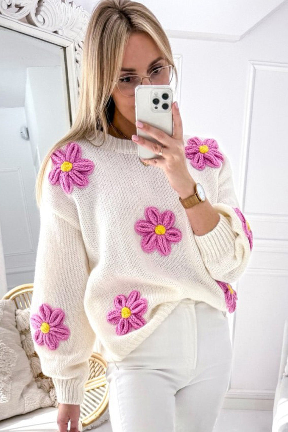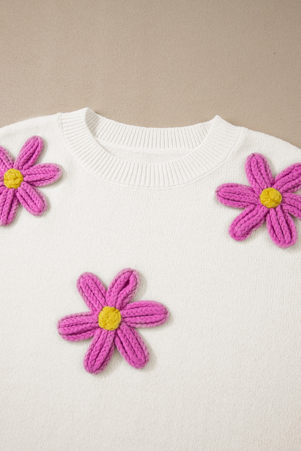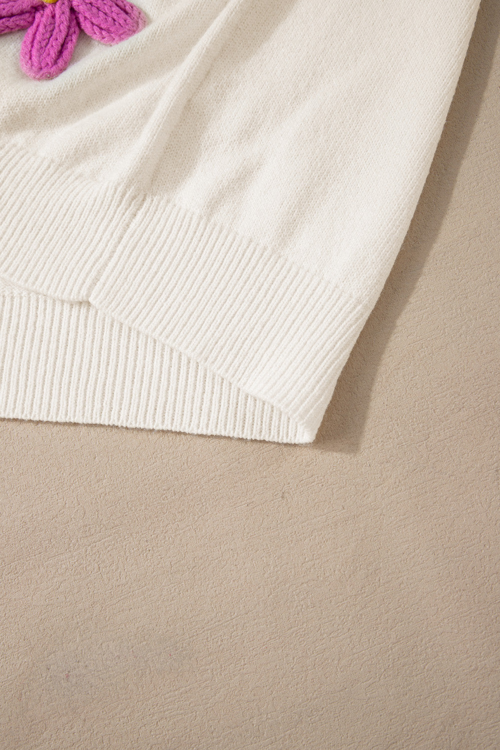 White Plus Size Flower Crochet Drop Shoulder Knit Sweater
