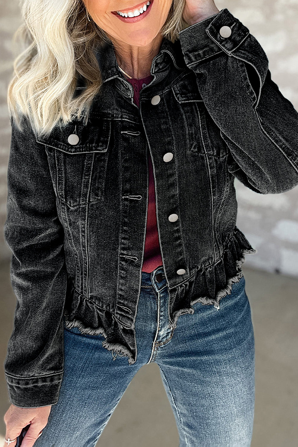 Beau Blue Ruffle Raw Hem Flap Pockets Denim Jacket