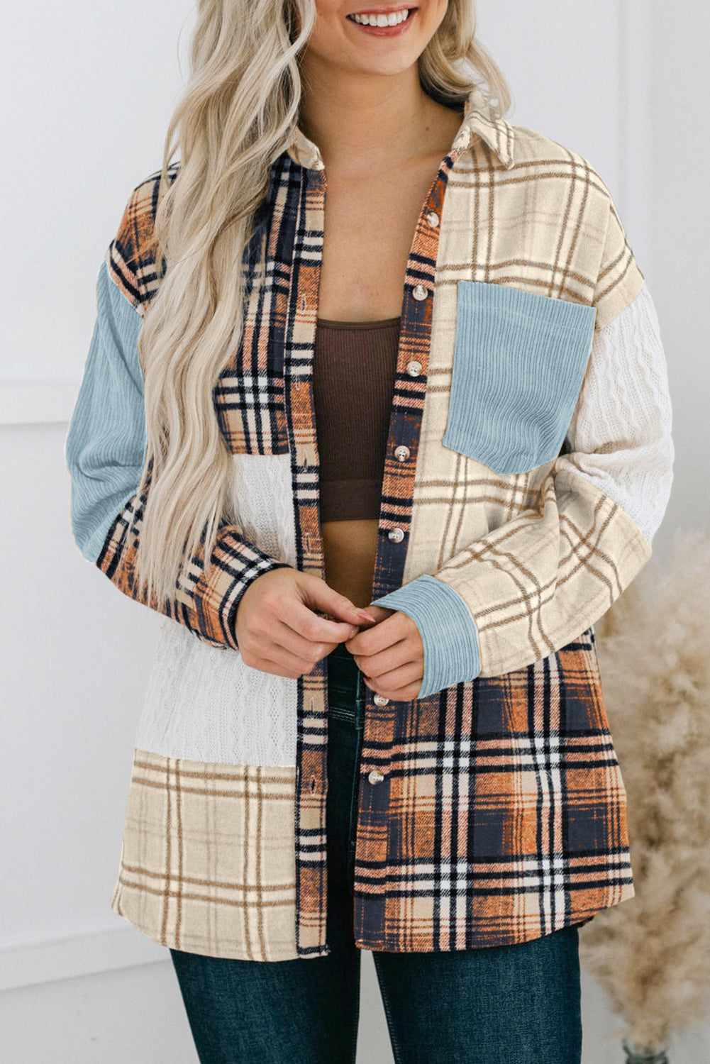 Orange Plaid Color Block Patchwork Shirt Jacket with Pocket