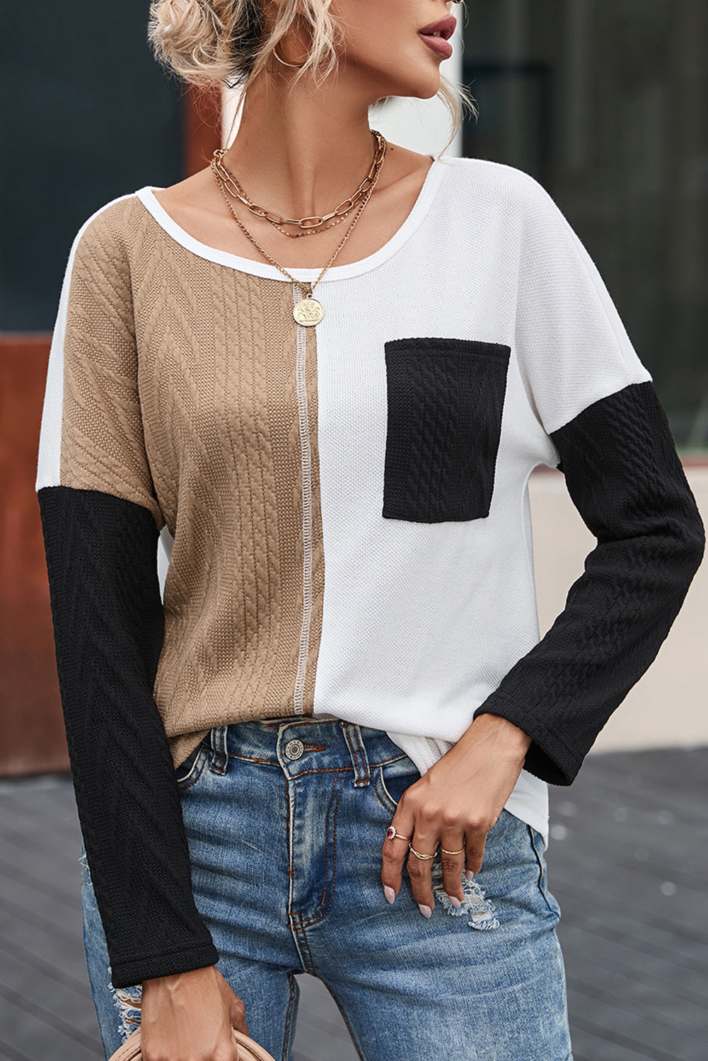 Orange Long Sleeve Colorblock Chest Pocket Textured Knit Top