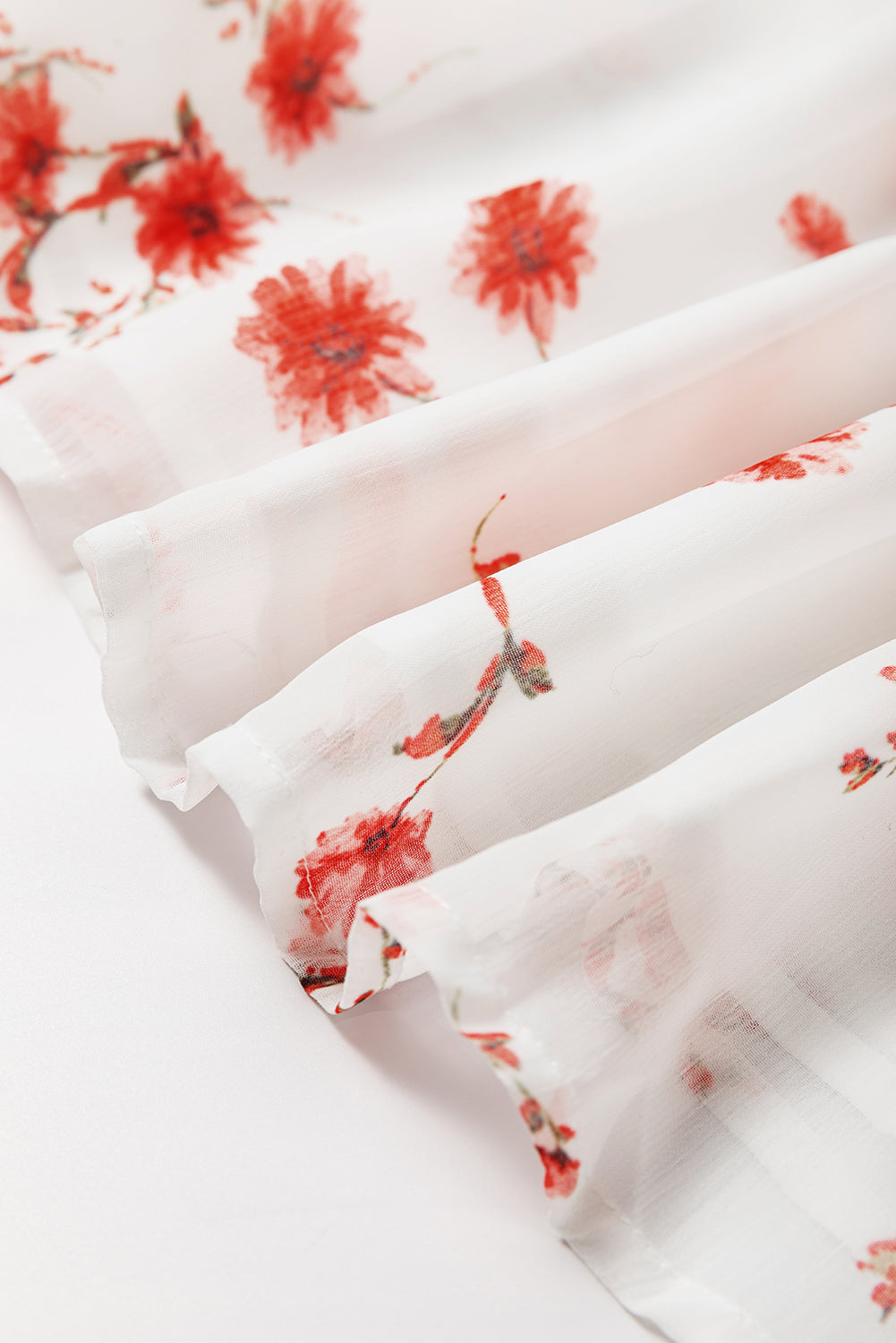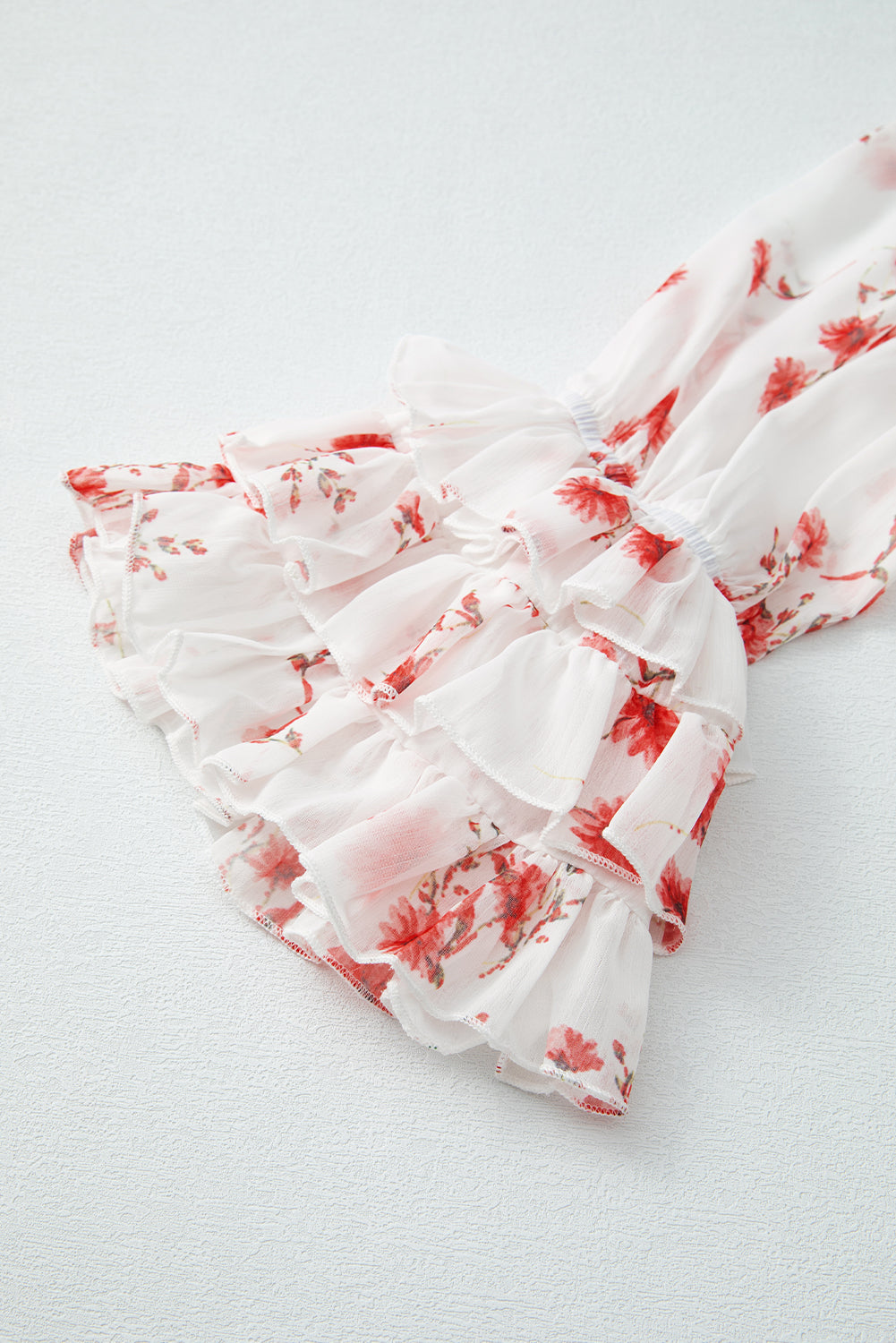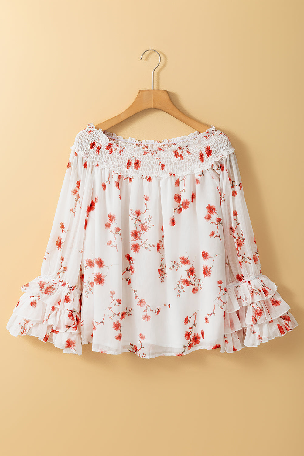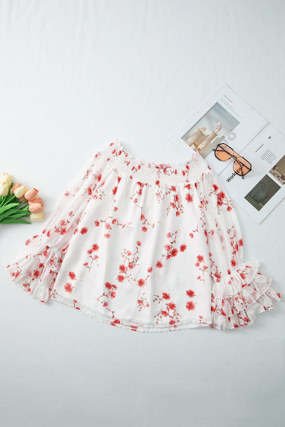 White Floral Print Shirred Off Shoulder Ruffled Sleeve Blouse