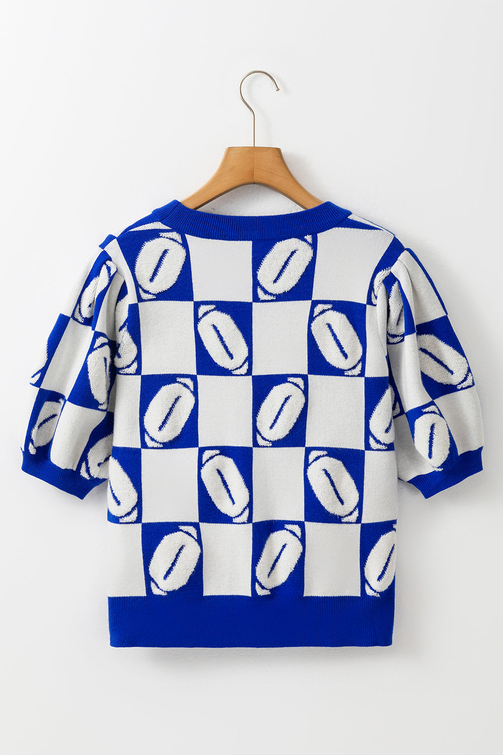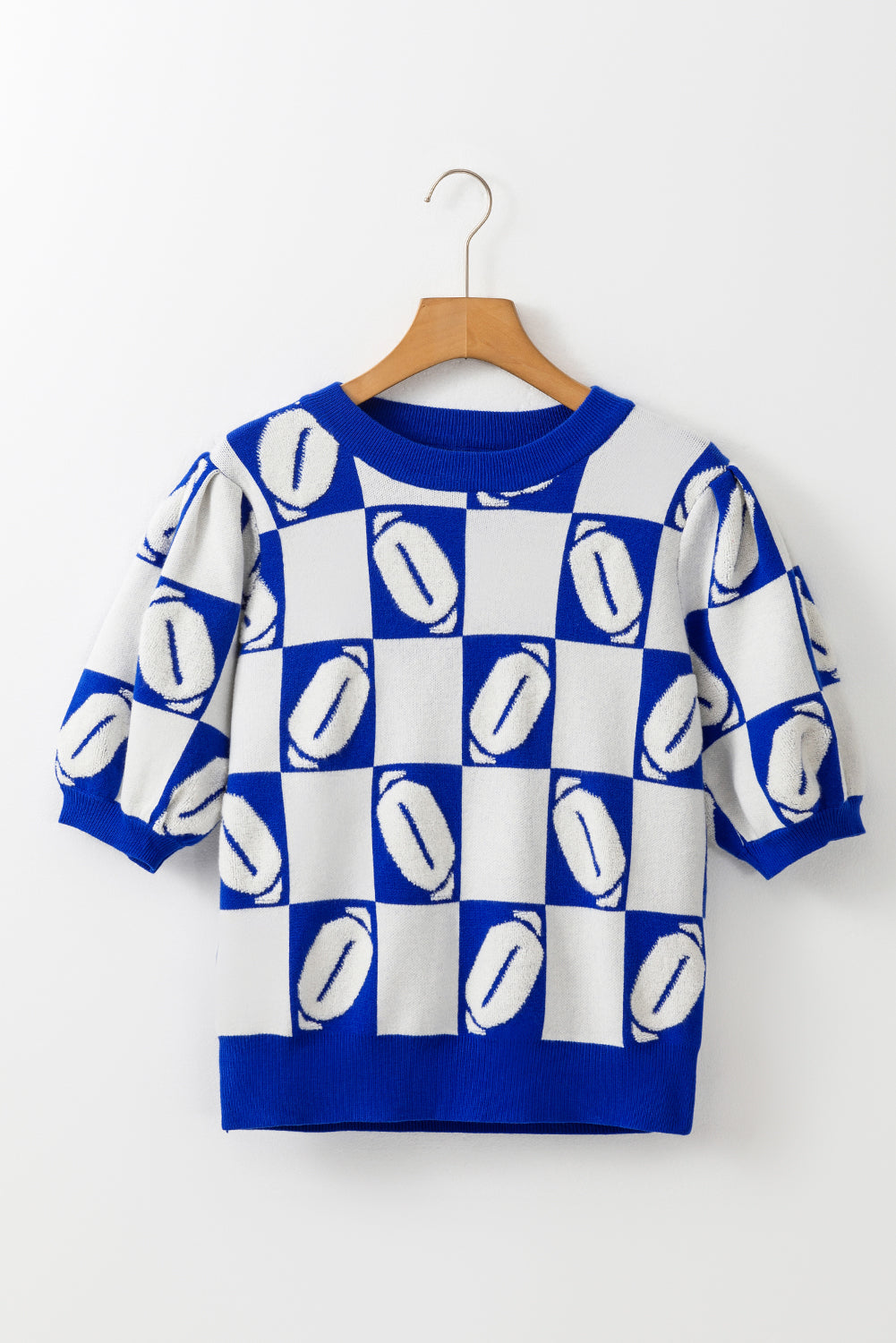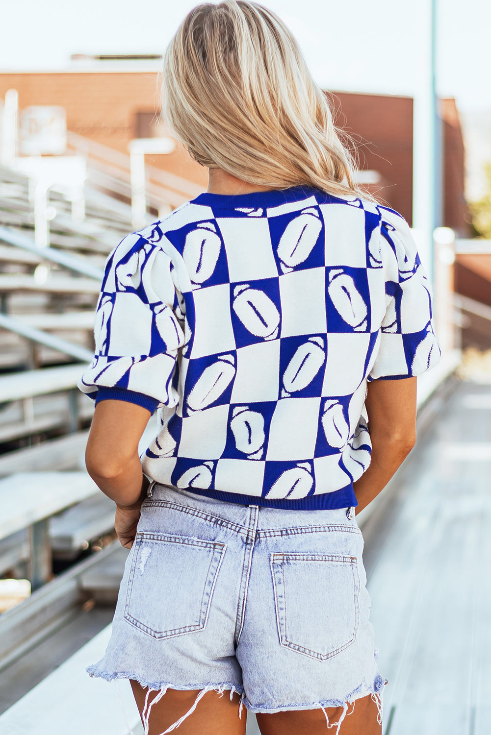Dark Blue Rugby Plaid Color Block Puff Short Sleeve Sweater