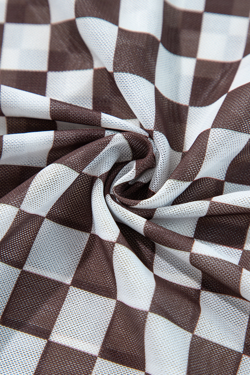 Brown Checkered Printed Long Sleeve High Neck Bodysuit