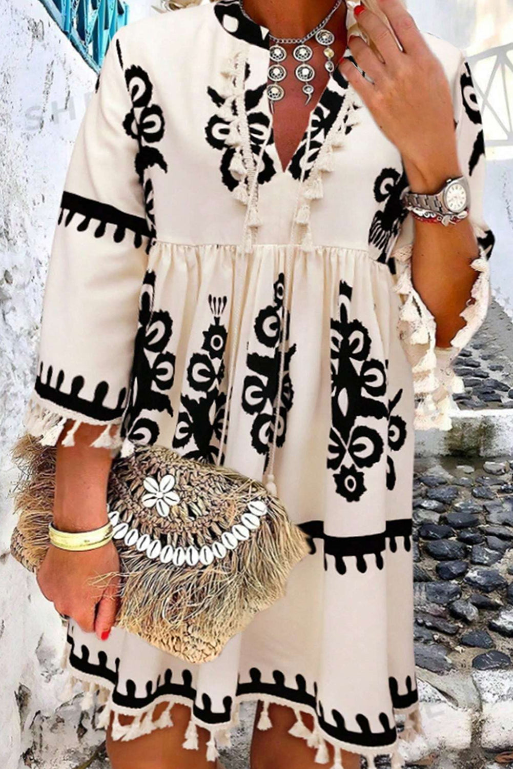 Orange Vintage Geometric Printed 3/4 Sleeve V Neck Blouse