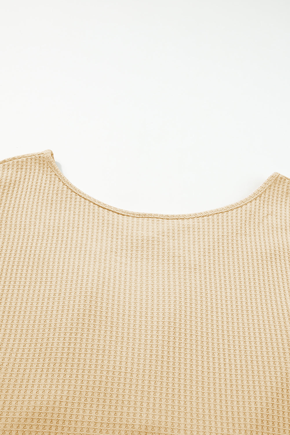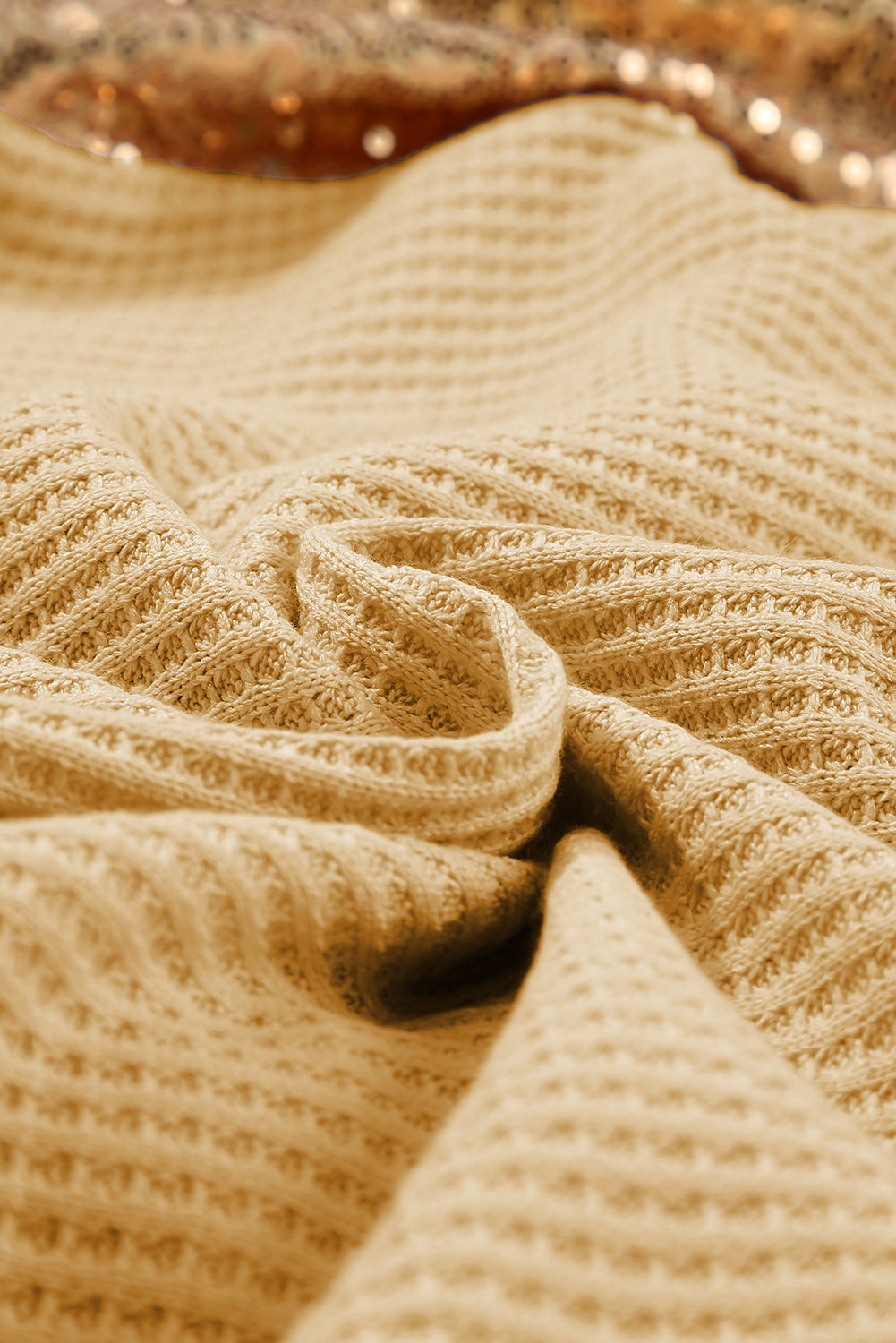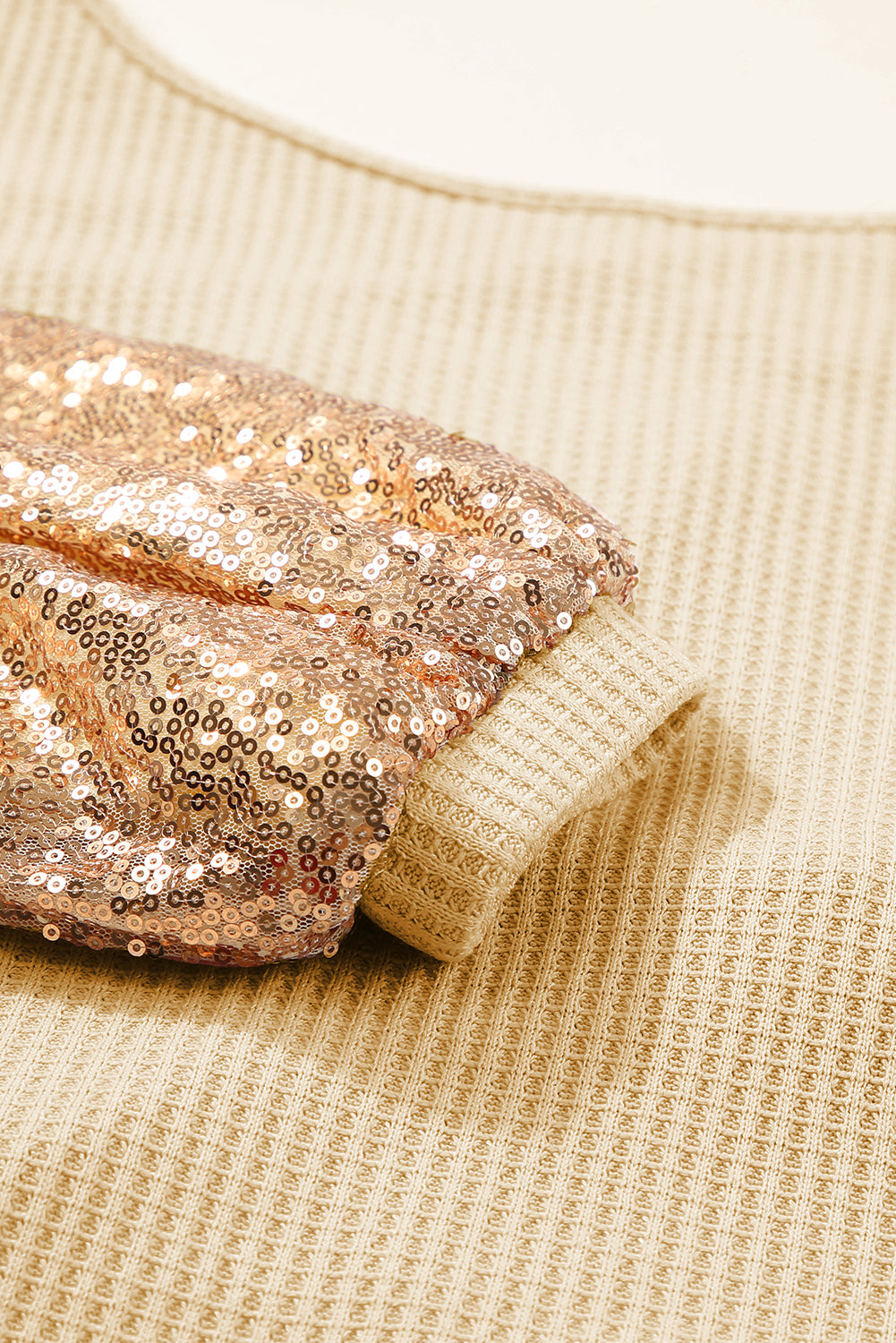 Apricot Sequin Patchwork Sleeve Open Back Waffle Knit Top