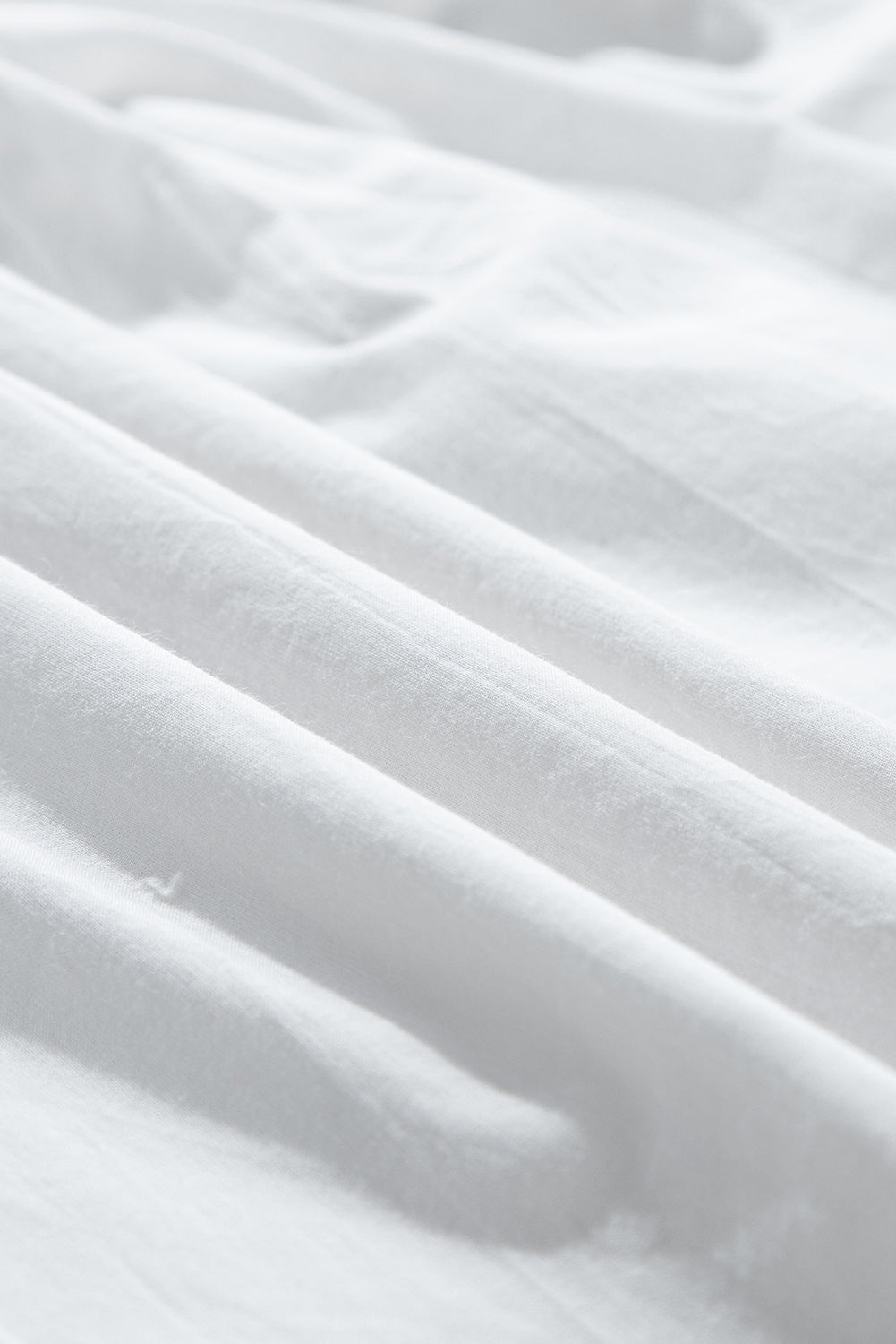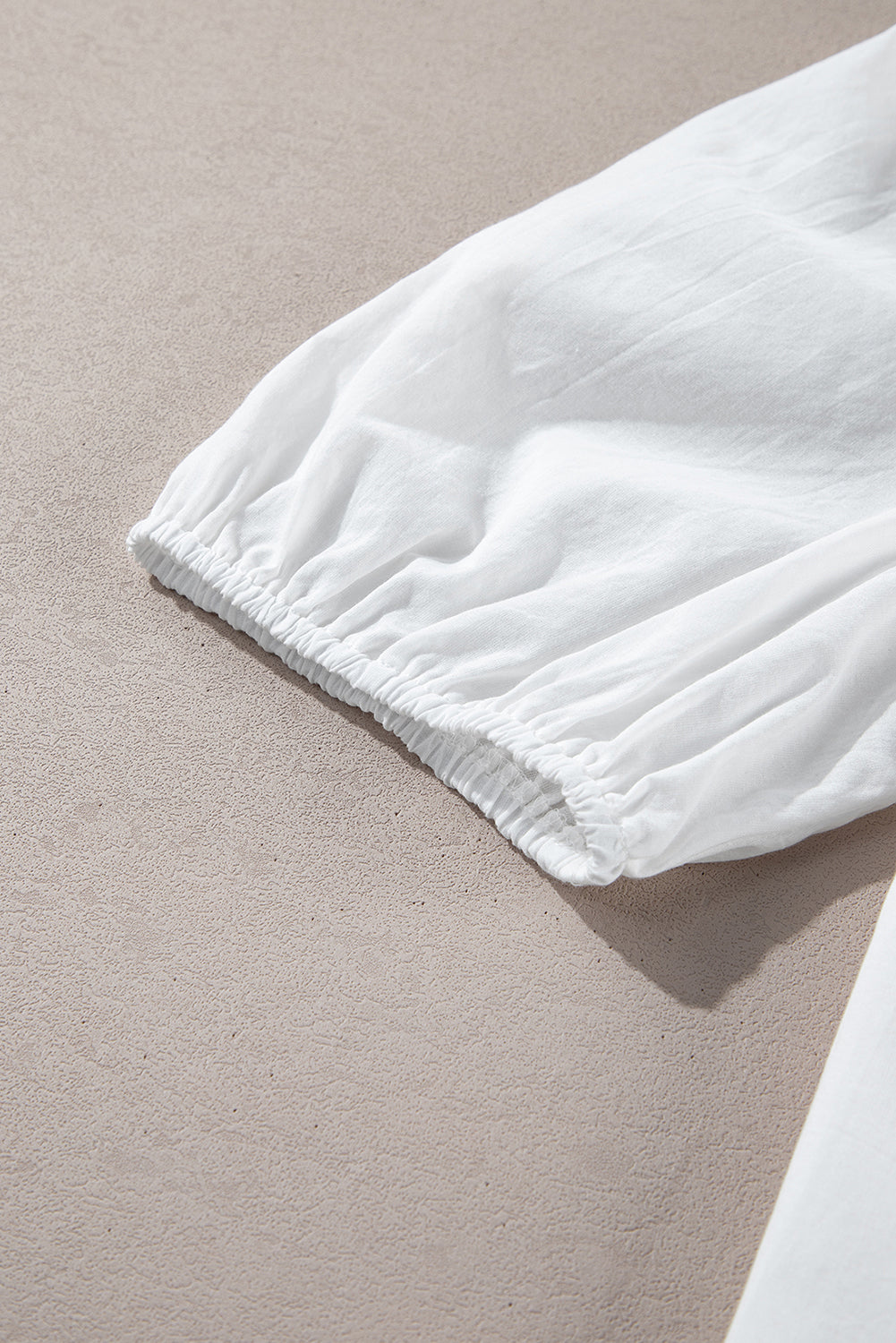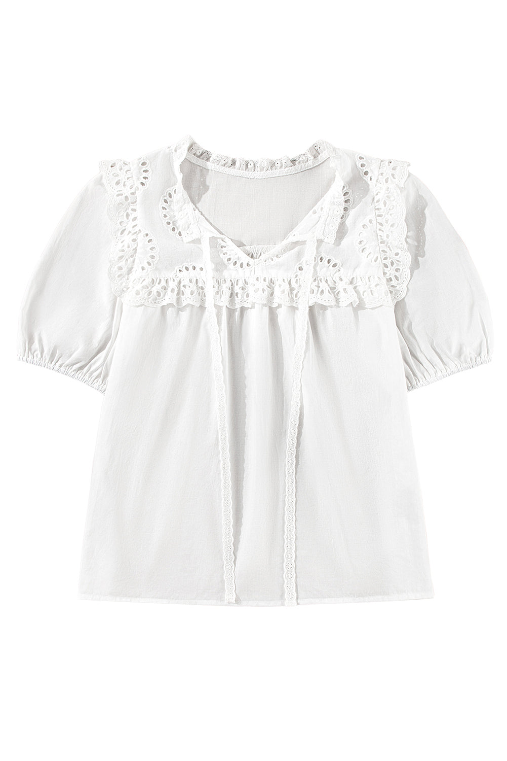 White Embroidered Lace Patchwork Tie Neck Puff Short Sleeve Blouse