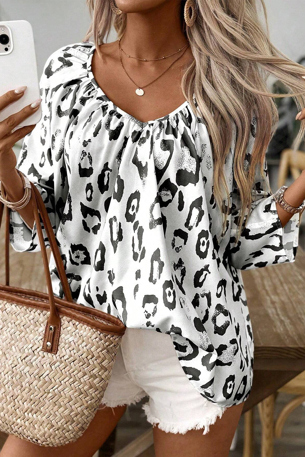Black Leopard Print Ruched V Neck 3/4 Sleeve Blouse