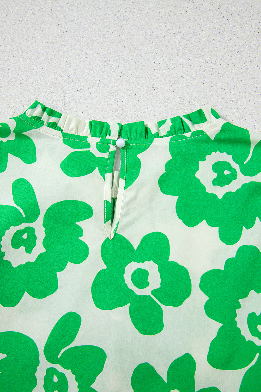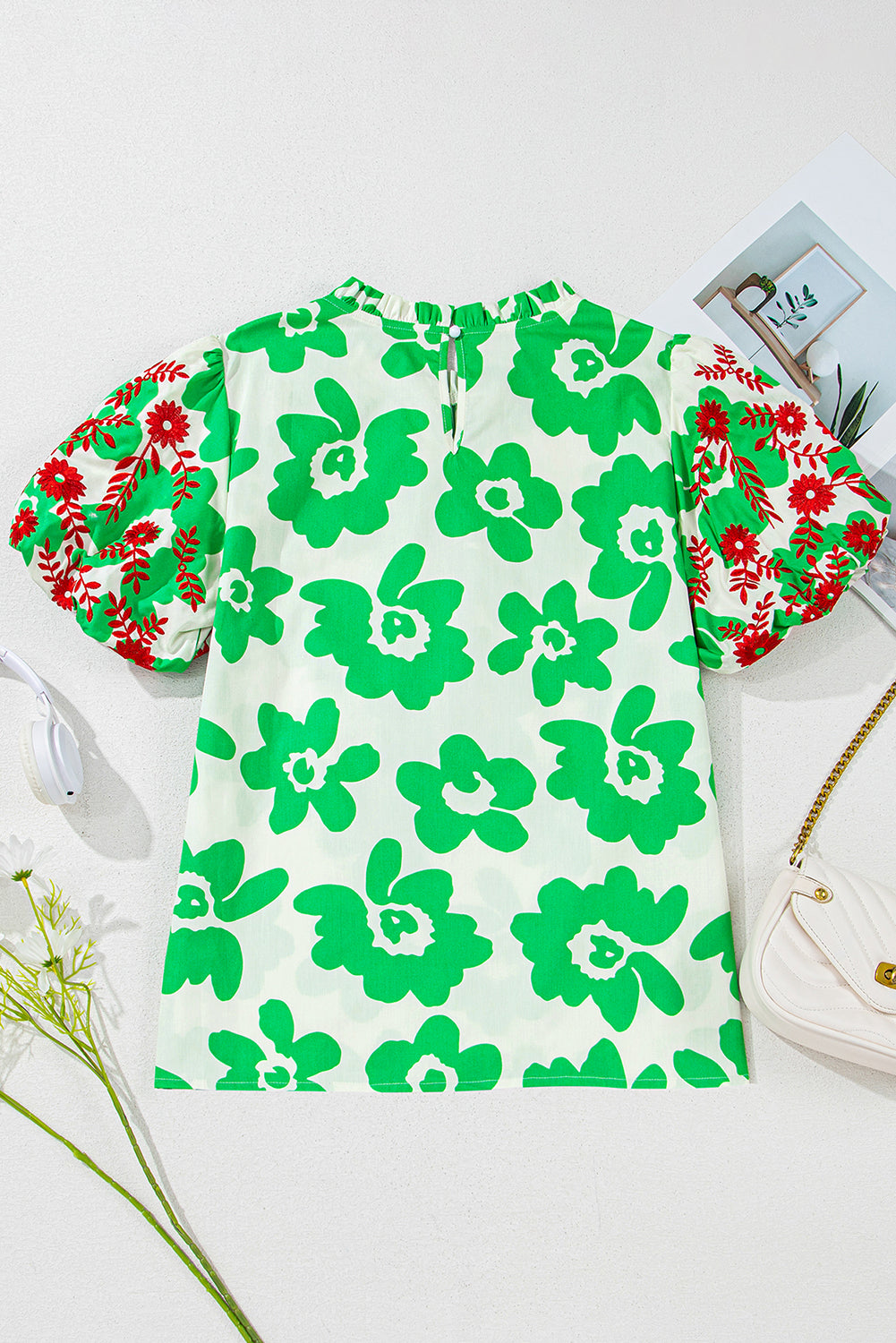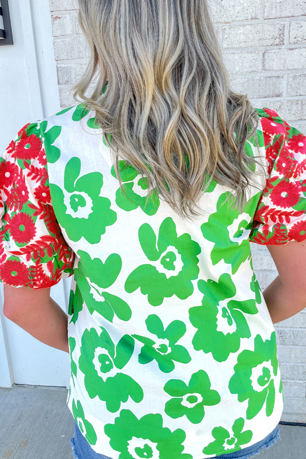 Green Contrast Embroidered Puff Short Sleeve Floral Blouse