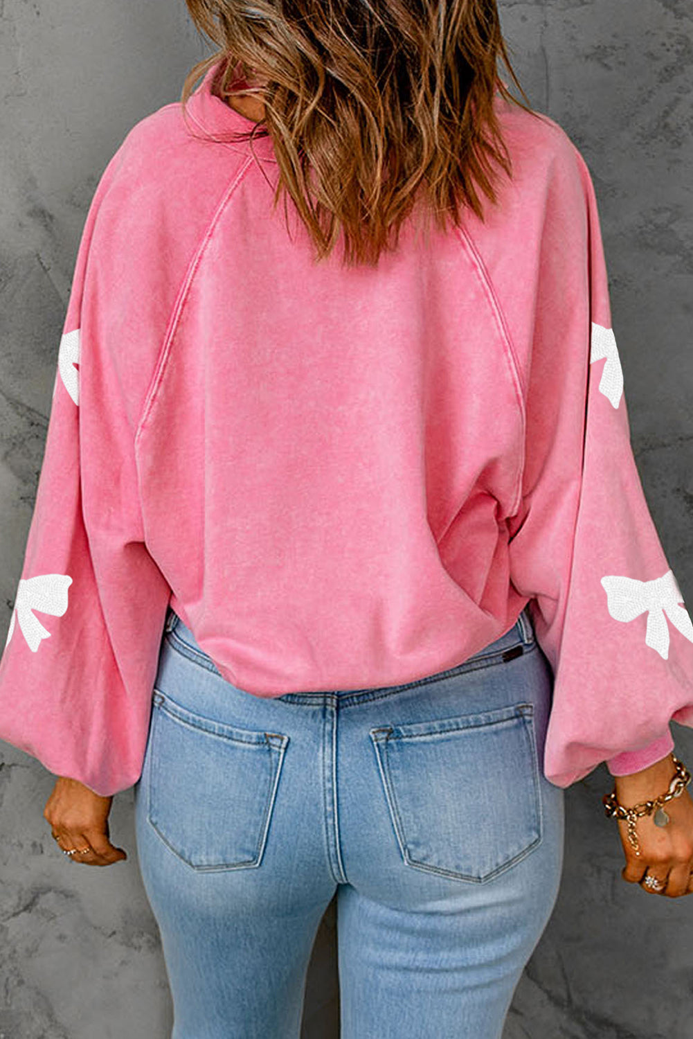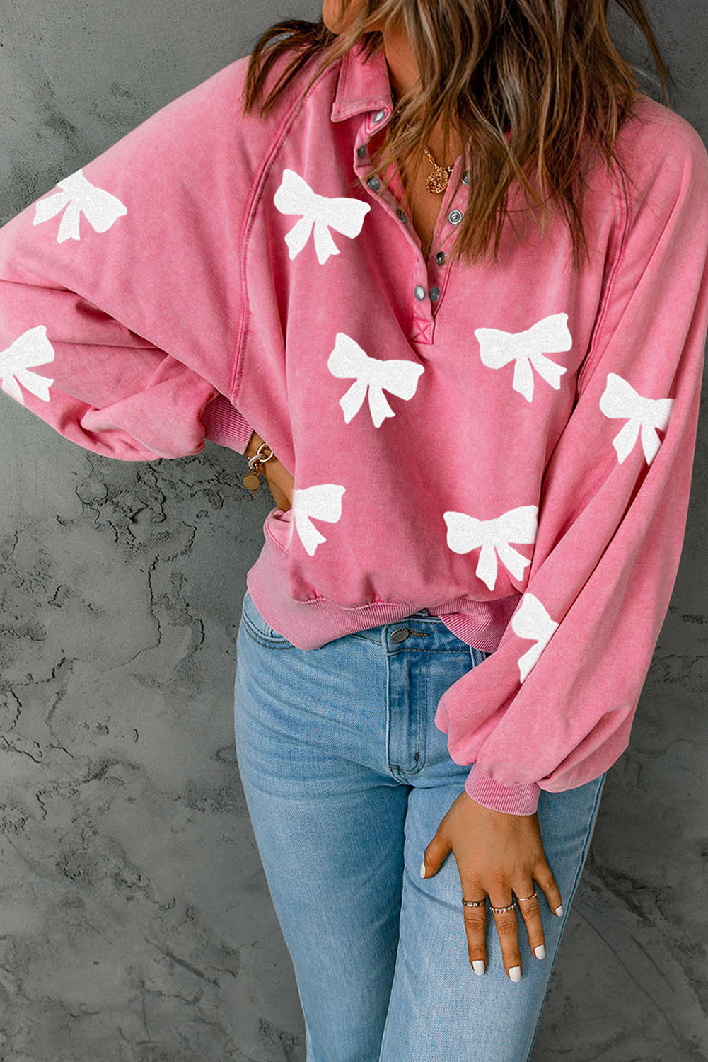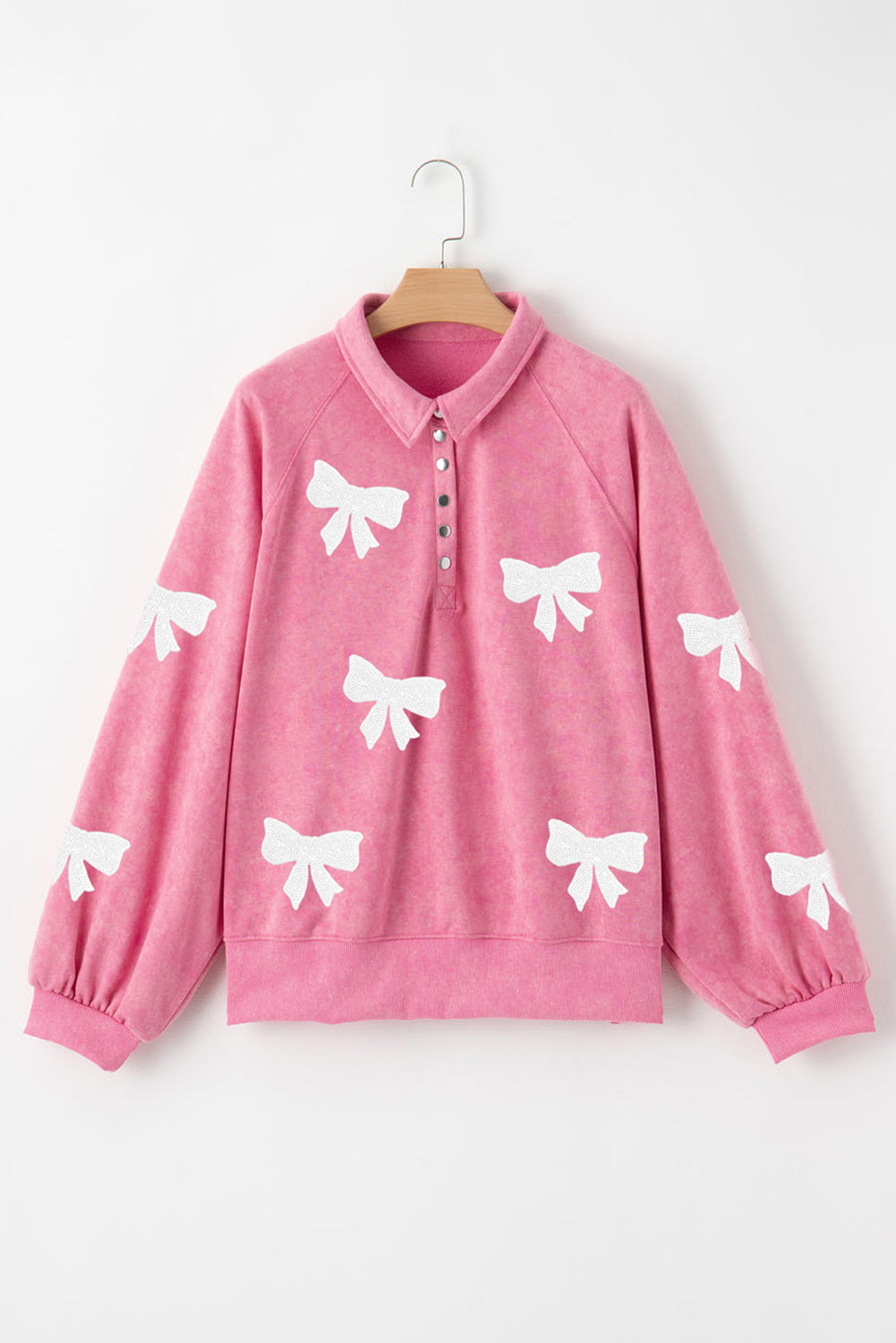 Pink Bow Pattern Snap Buttons Collared Pullover Sweatshirt