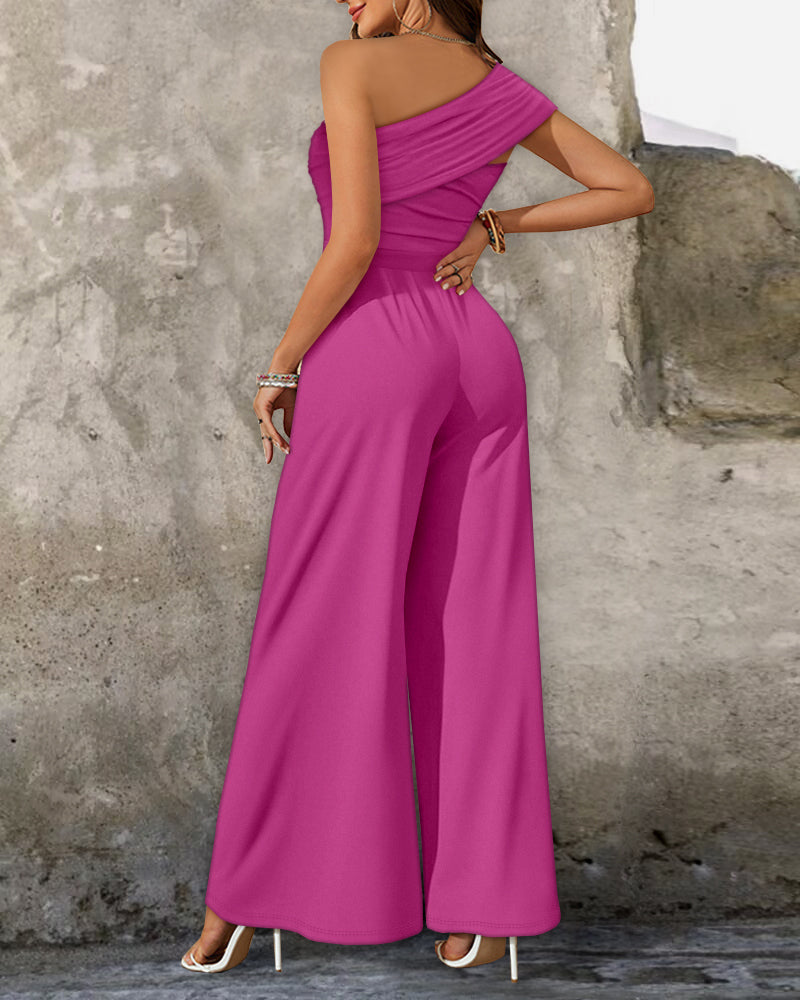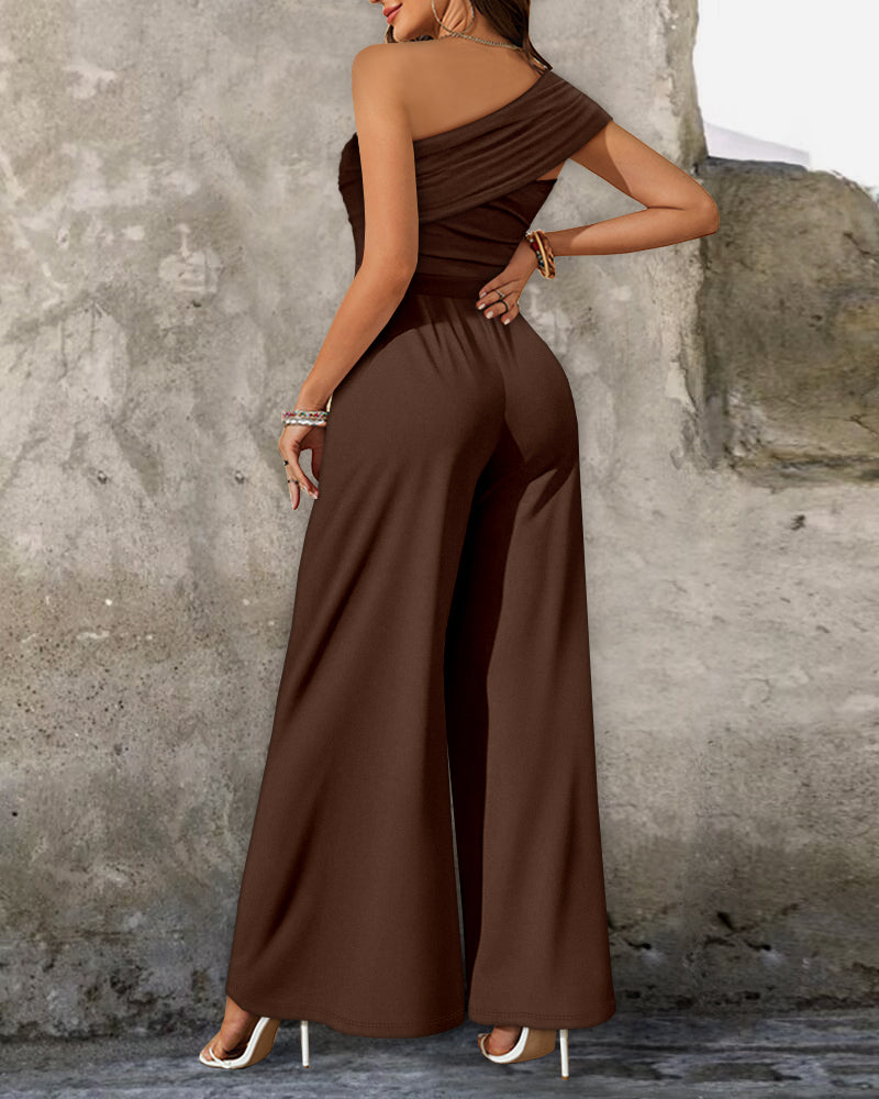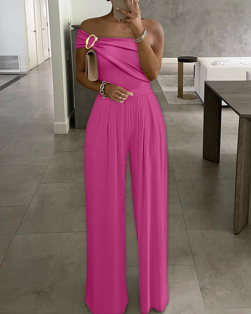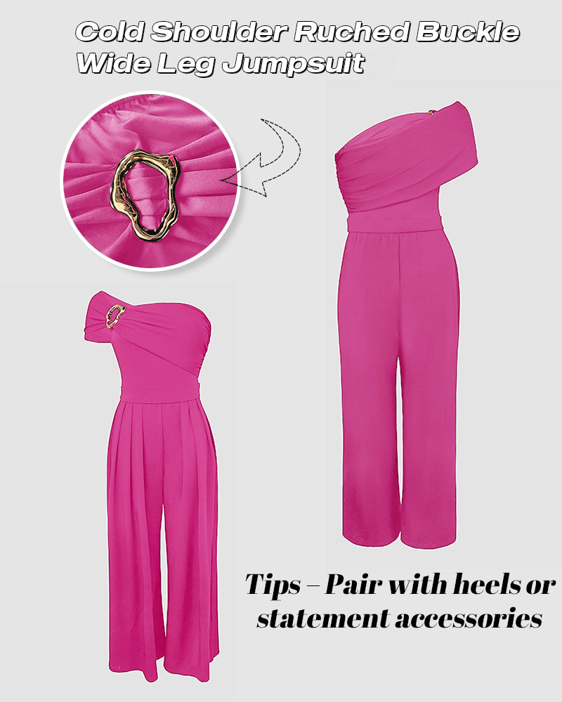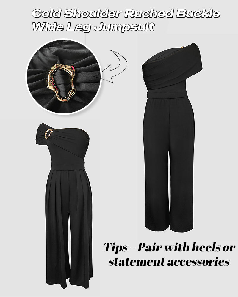 Cold Shoulder Ruched Buckle Wide Leg Jumpsuit