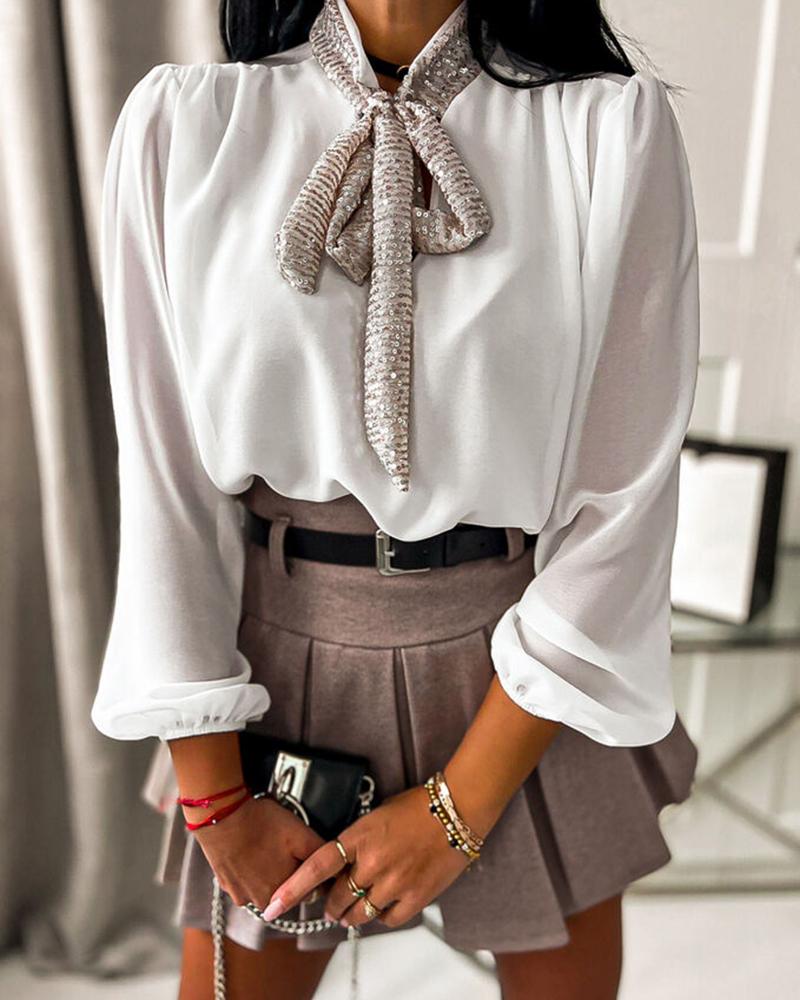 Contrast Sequin Tie Neck Long Sleeve Top