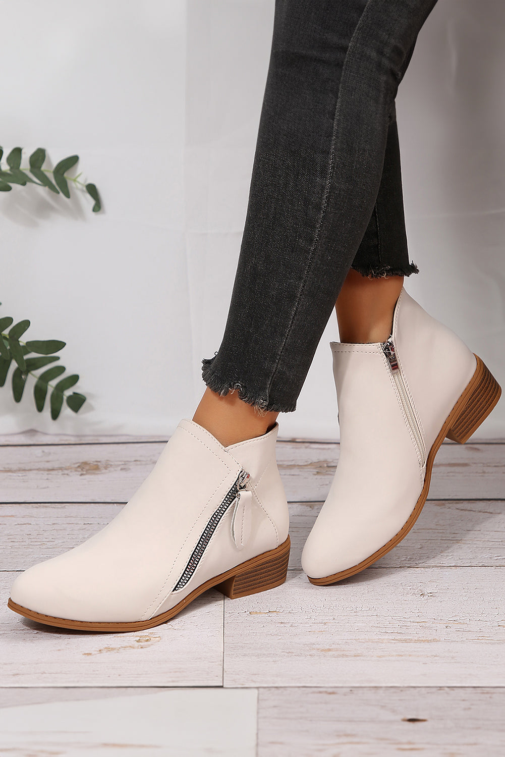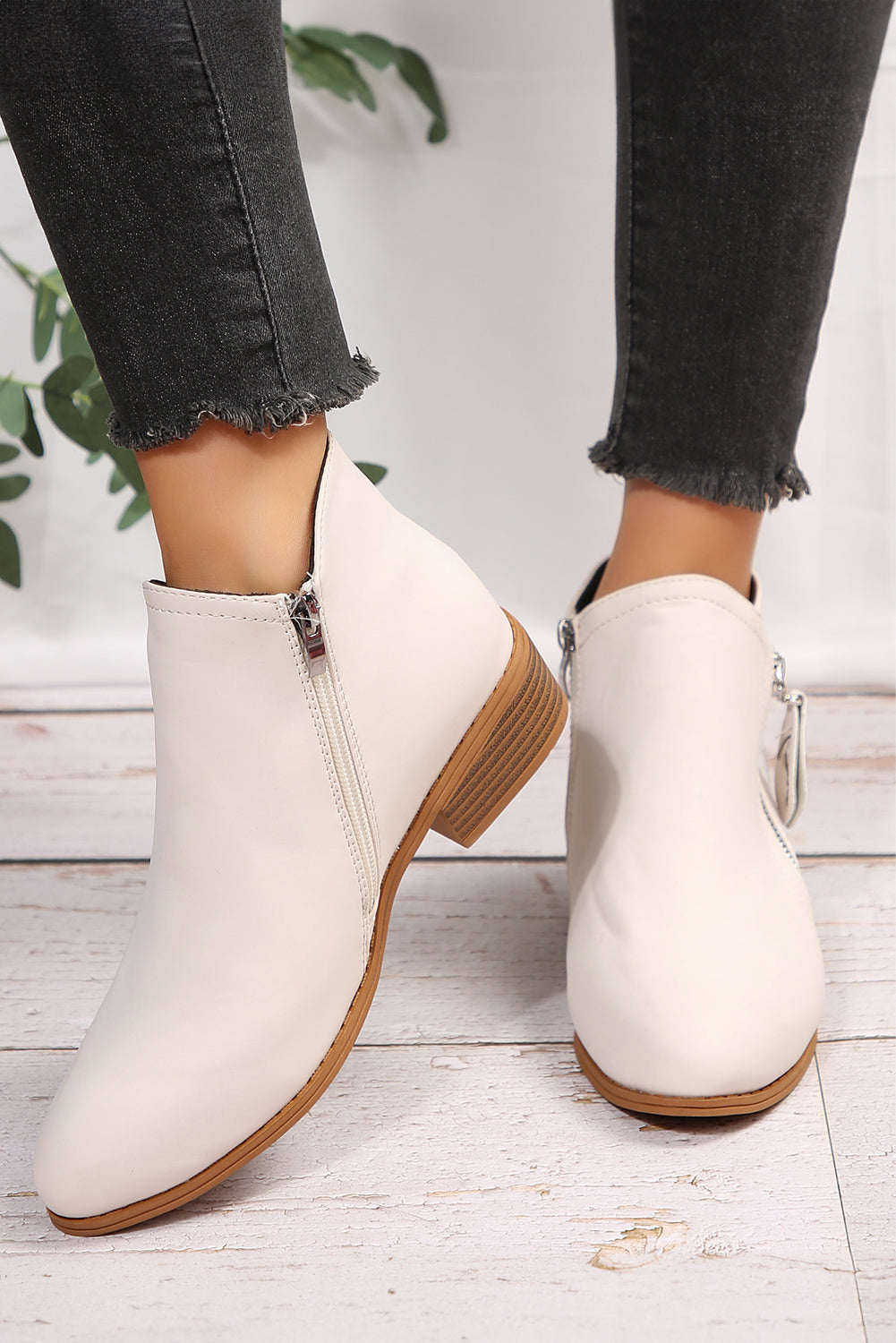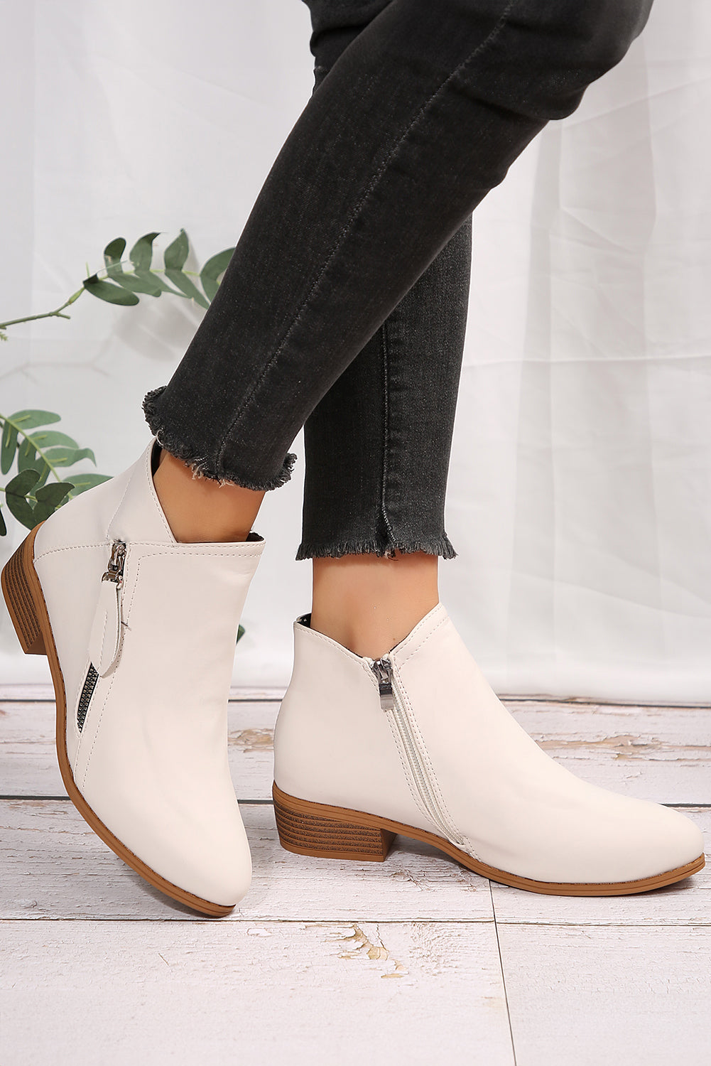 White Faux Leather Double Zip Low Heel Ankle Boots