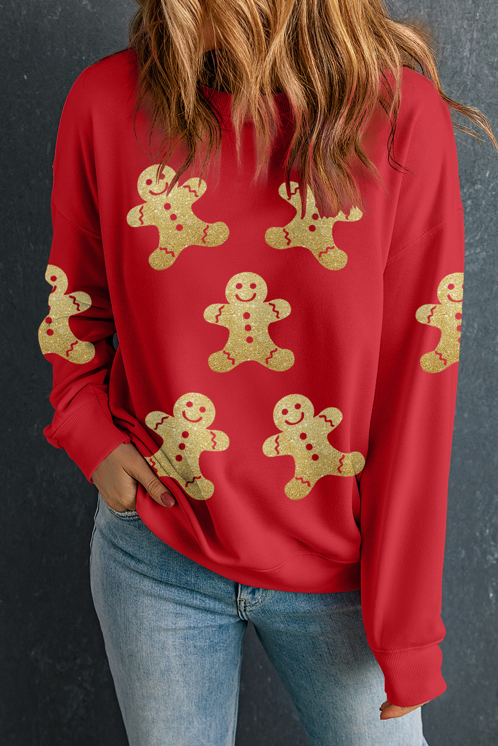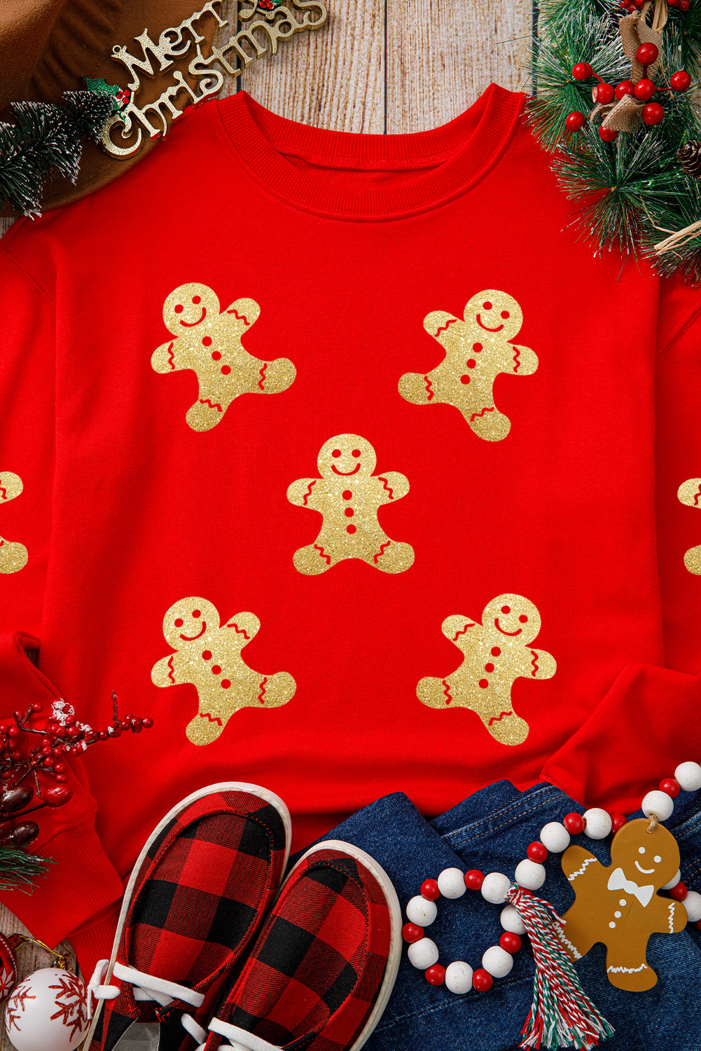 Red Cute Gingerbread Print Christmas Pullover Sweatshirt