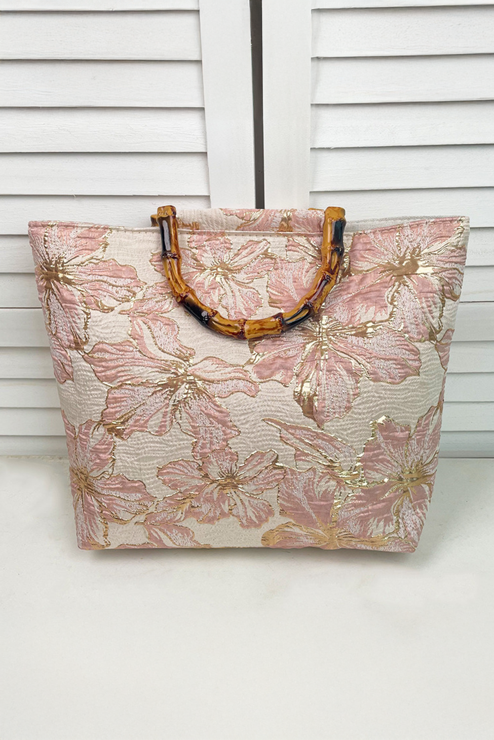Light Pink Flower Canvas Tote Bag with Bamboo Handle
