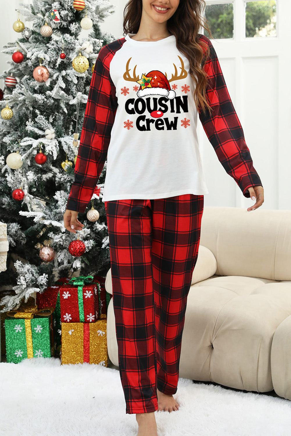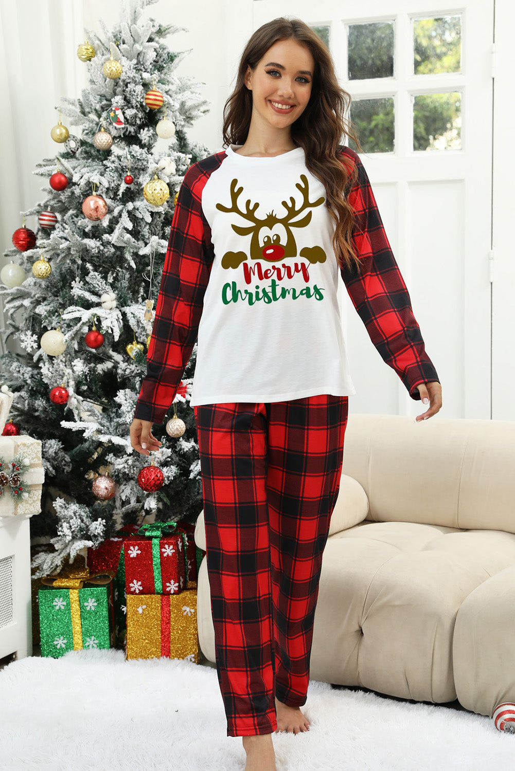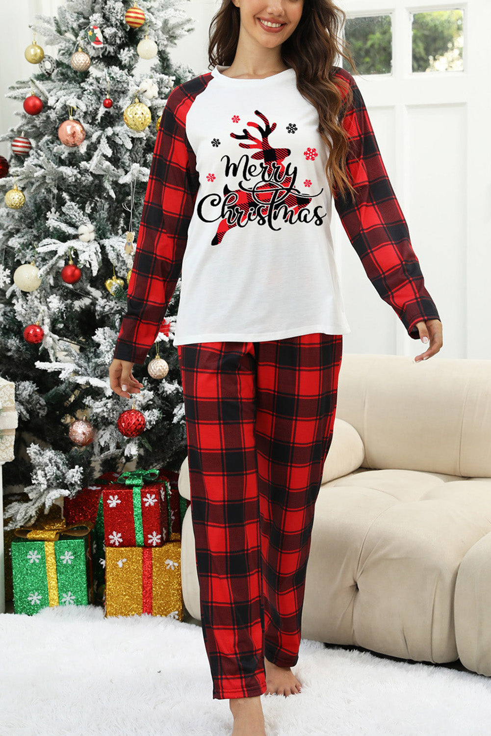 White Christmas Plaid Reindeer Graphic Long Sleeve Lounge Set
