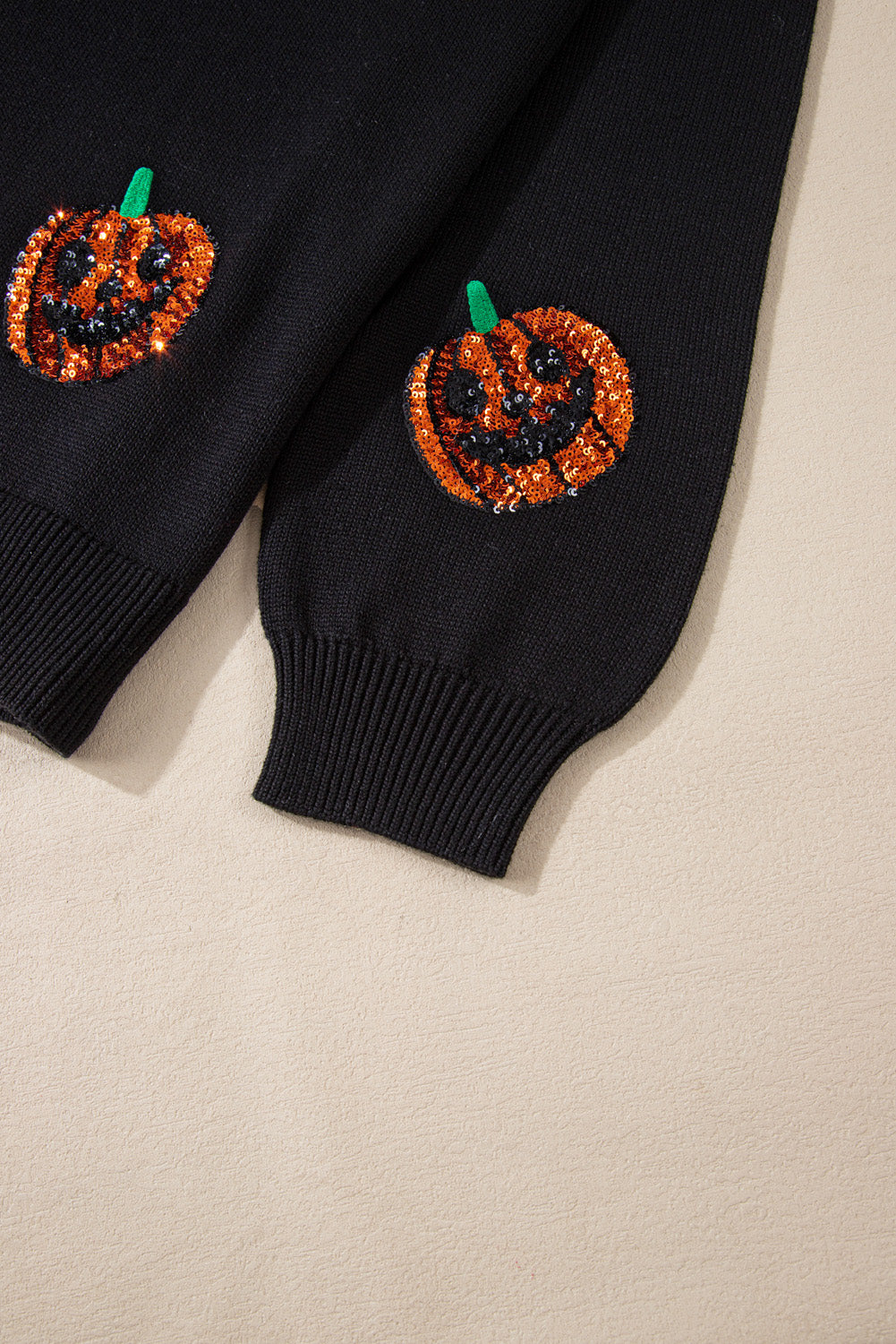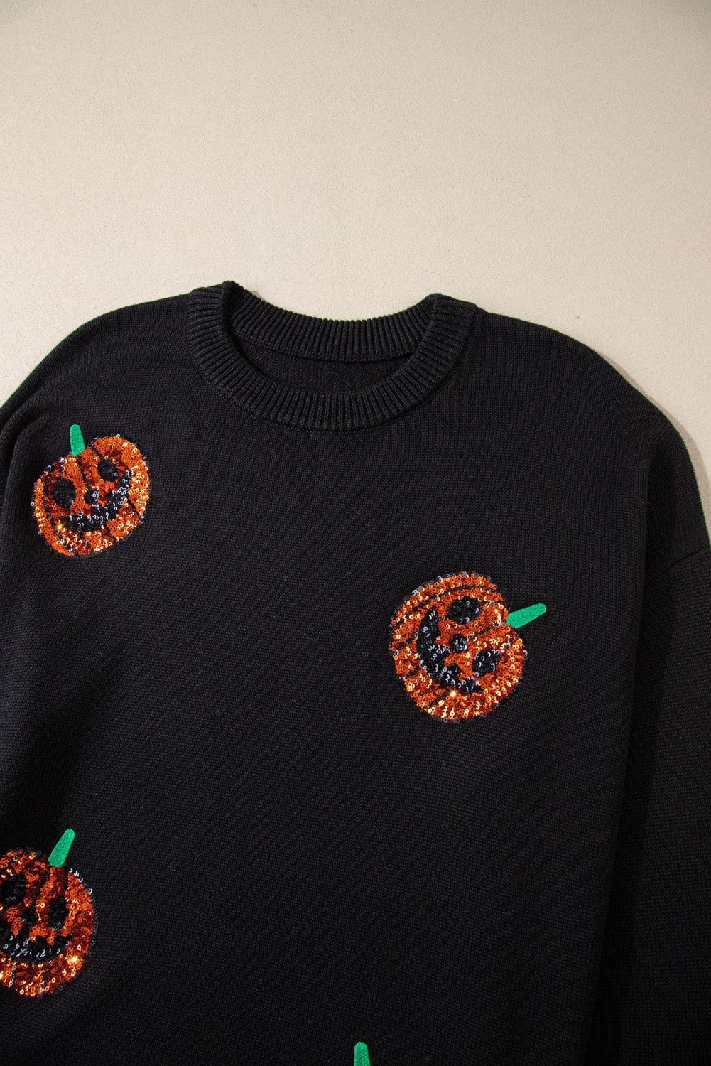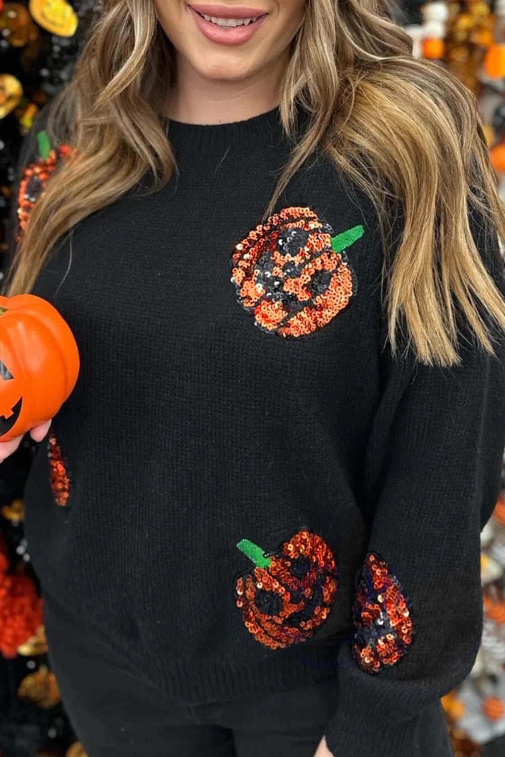 Black Plus Size Halloween Sequined Pumpkin Pattern Sweater
