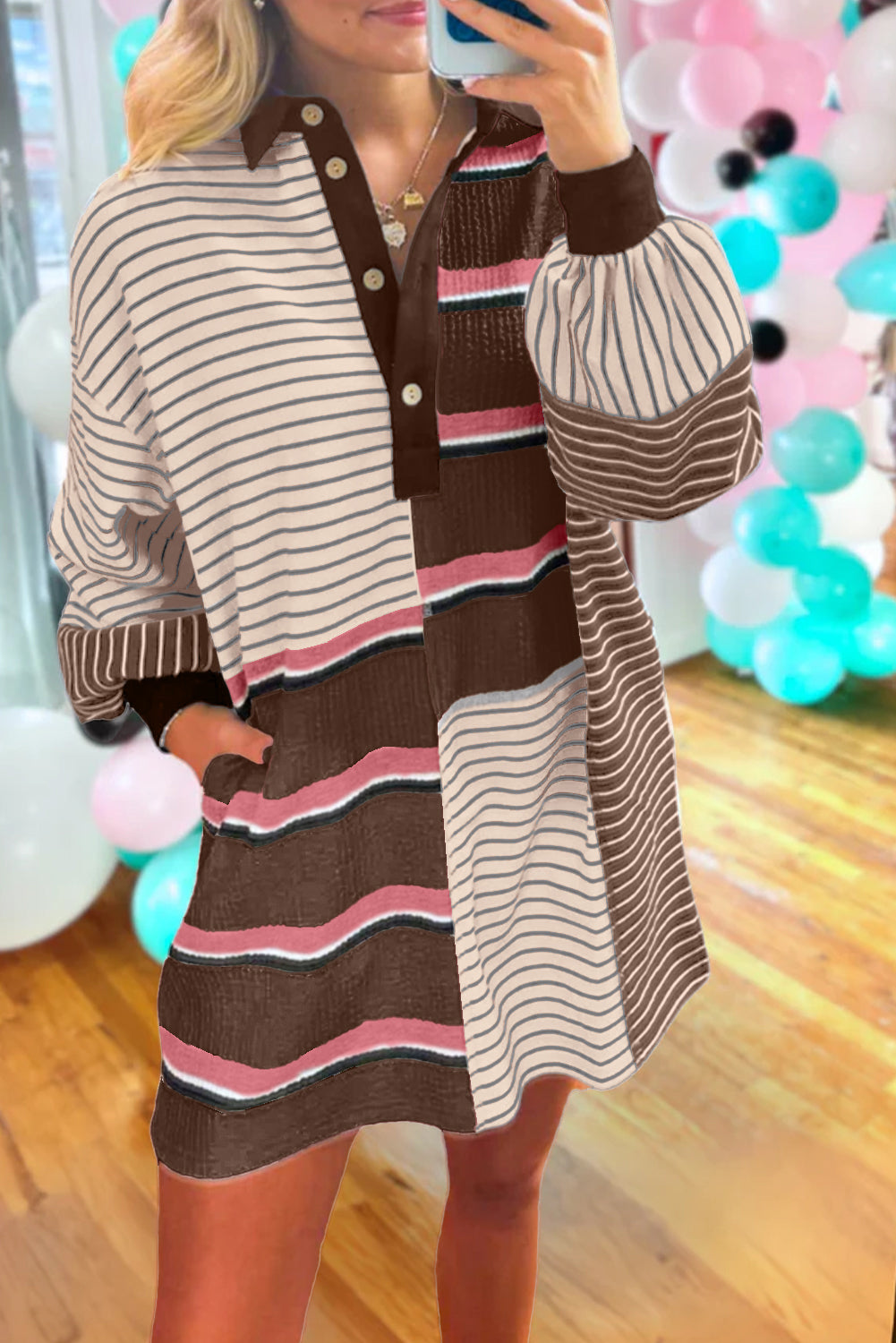 Black Stripe Colorblock Knit Henley Collar Shift Long Sleeve Mini Dress