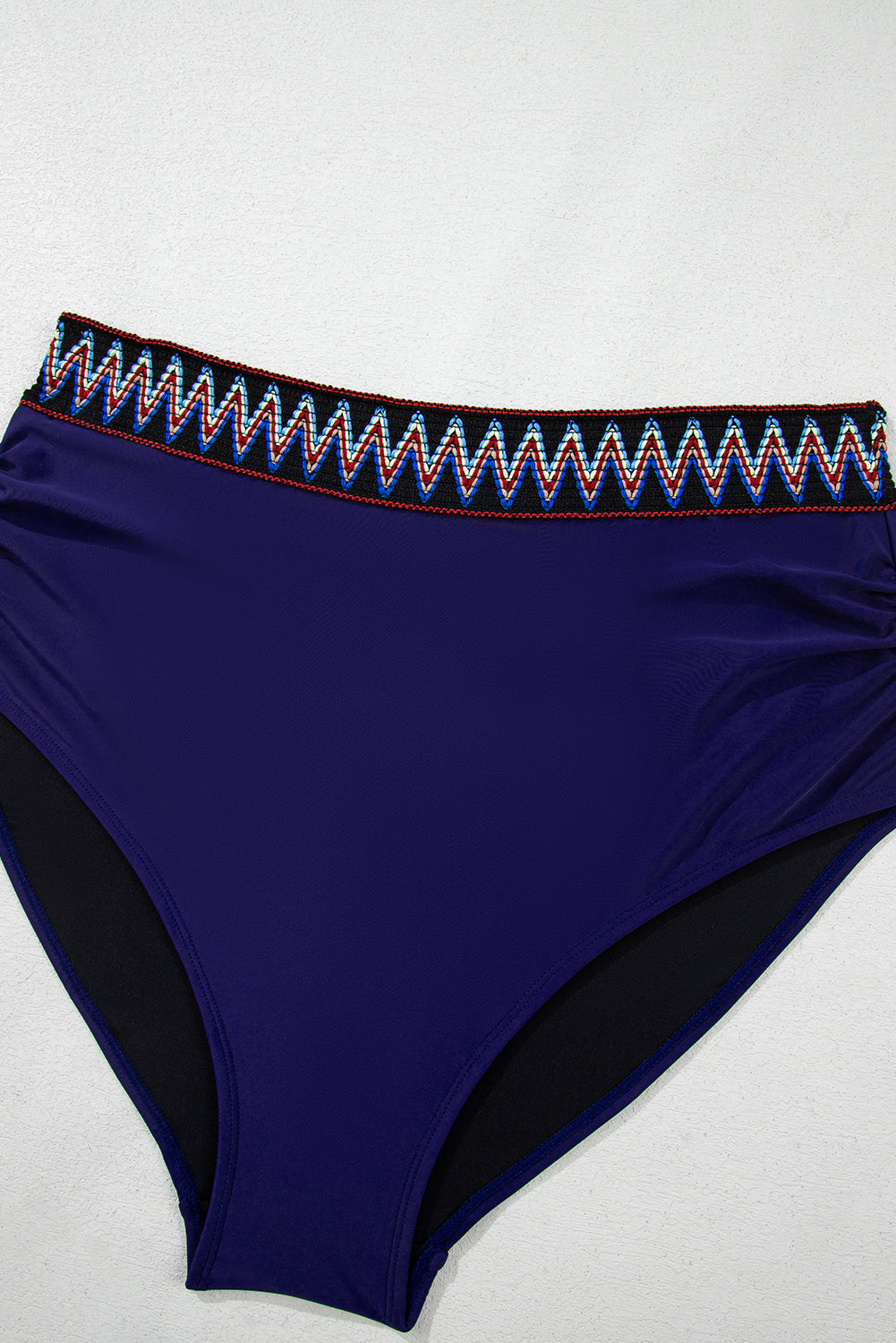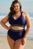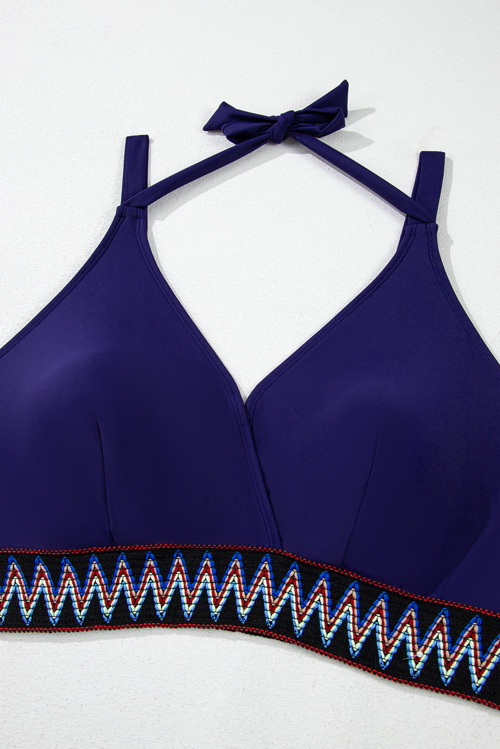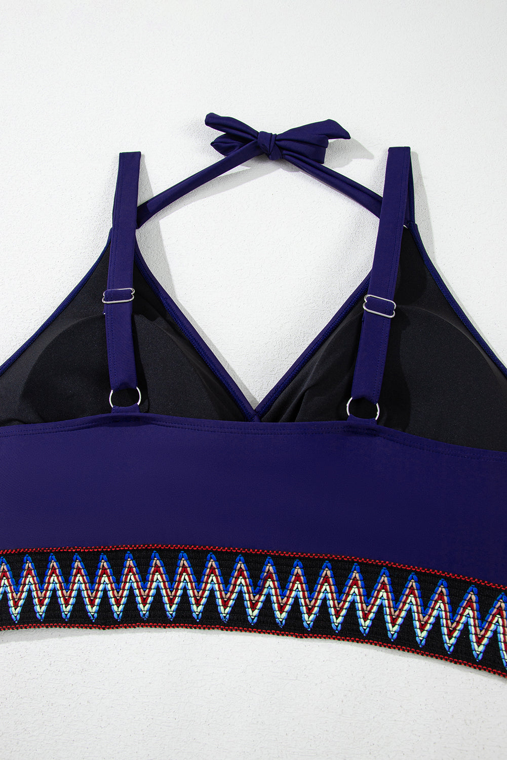 Navy Blue Embroidered Trim Wrap Tie Knot Plus Size High Waisted Bikini