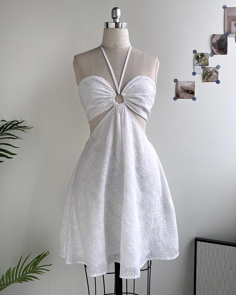 Floral Print Halter Tied Detail Elastic Shirred Back Mini Dress Casual A Line Dress