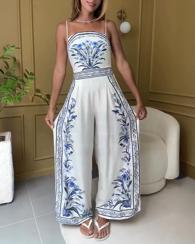 Floral Print Shirred Waist Jumpsuit Casual Backless Wide Leg Romper