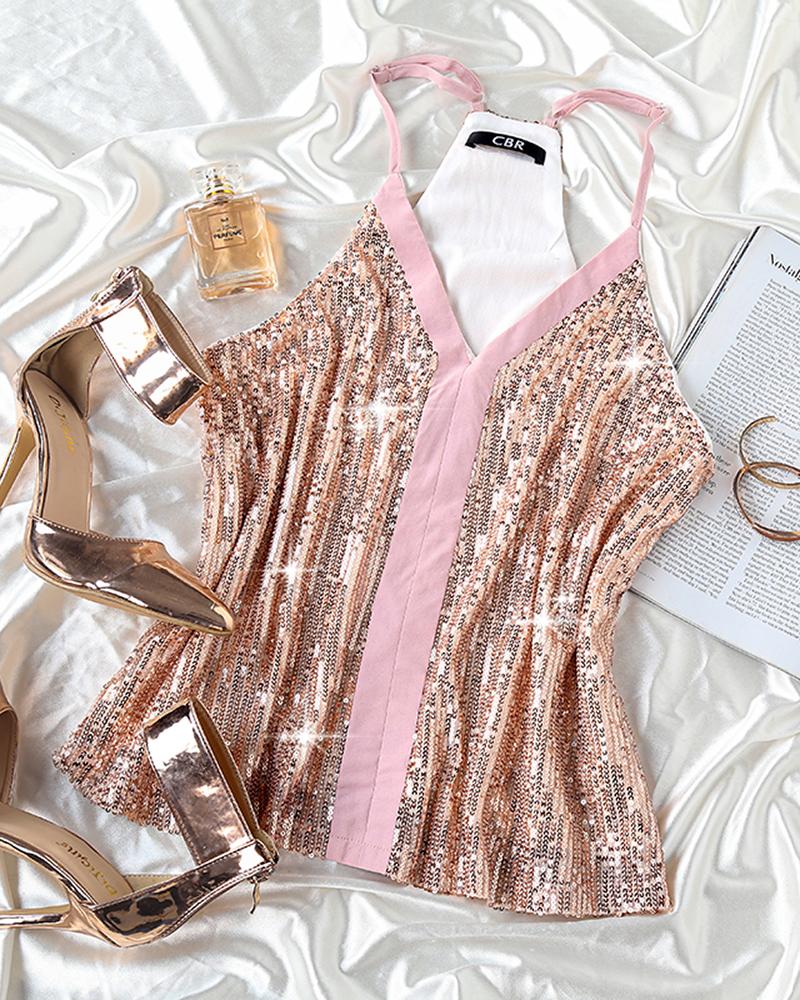 Halter Backless Contrast Binding Sequins Top