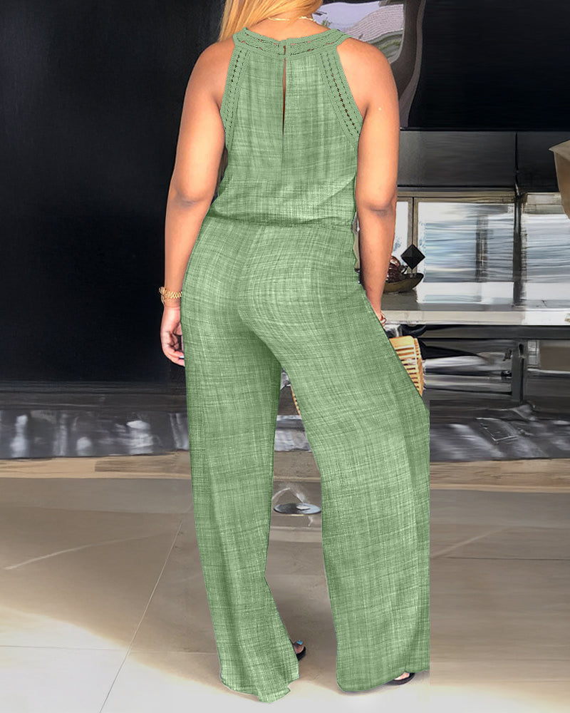 Halterneck Hollow out Lace Patchwork Drawstring Waist Wide Leg Jumpsuits