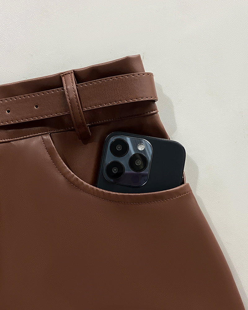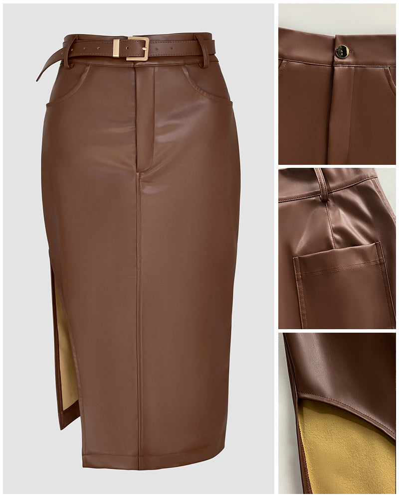 High Waist Casual Asymmetrical Slit Pu Mid Calf Dress with Metal Belt