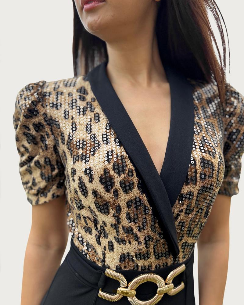 Leopard Pattern Contrast Sequin Deep V Neck Short Puff Sleeve Jumpsuits Metal O Ring Decor Casual Flared Overalls