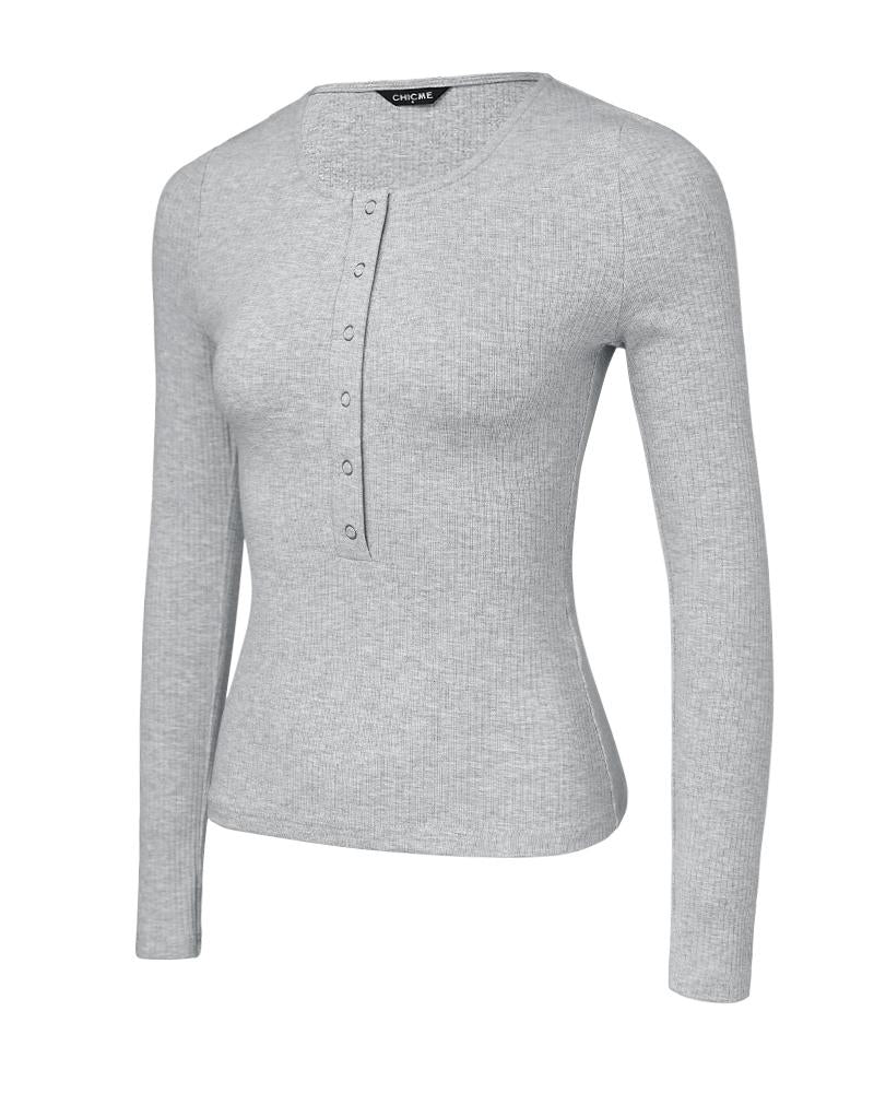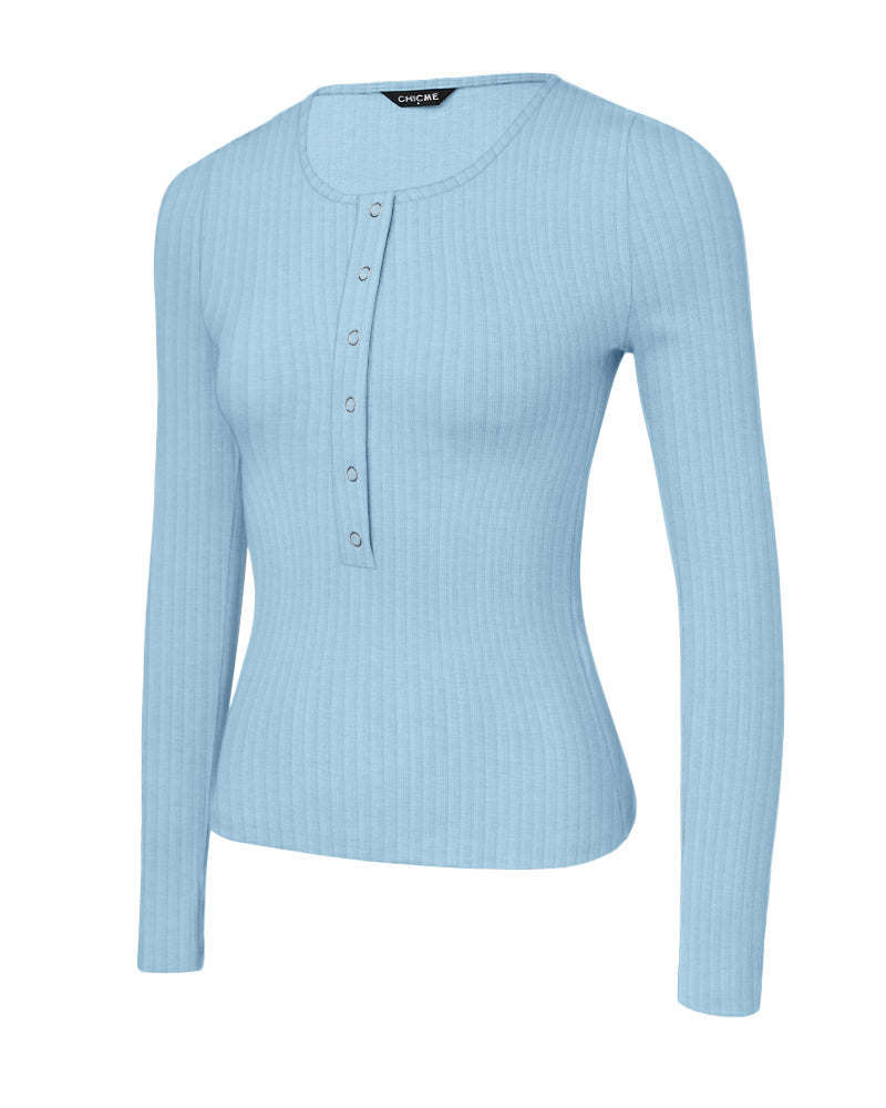 Long Sleeve Top Button Down Slim Fit Tops Crewneck Ribbed Knit Shirt