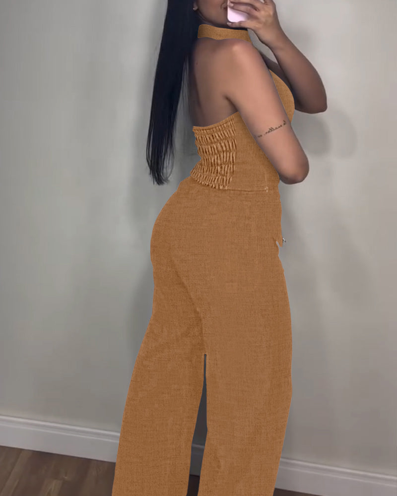 Mock Neck Sleeveless Petite Top with Casual Metal Button Decor Bootcut Pants Set