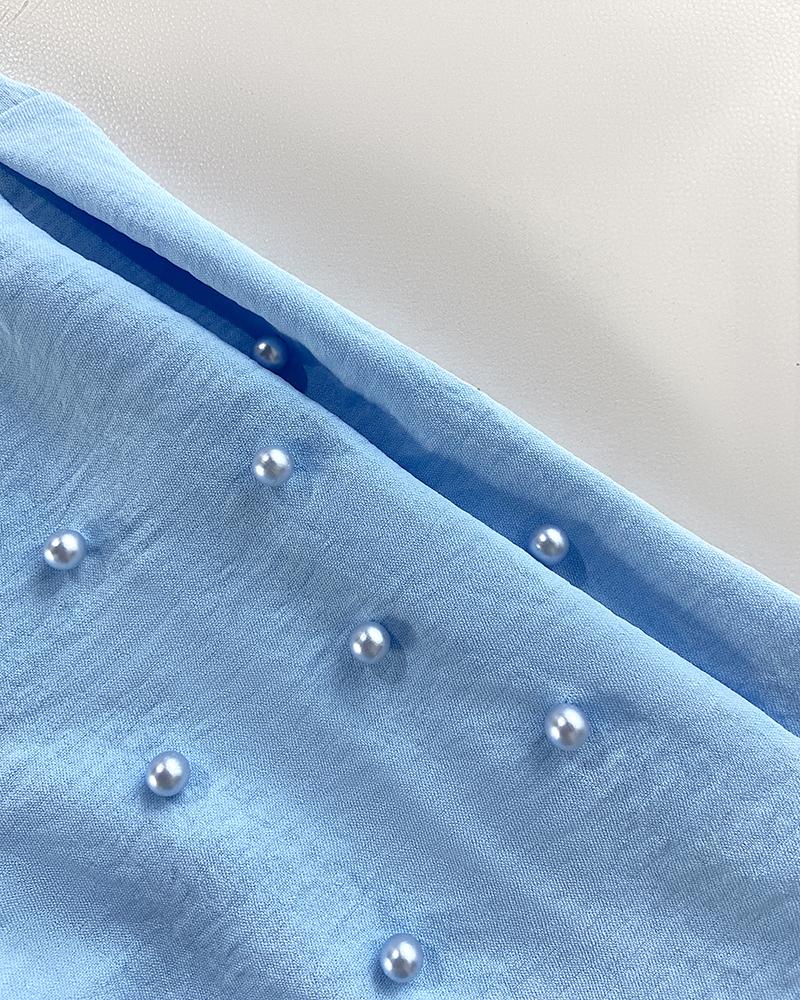 Pearl Decor Short Sleeve Ruched Waist Pleated Dress with Belt