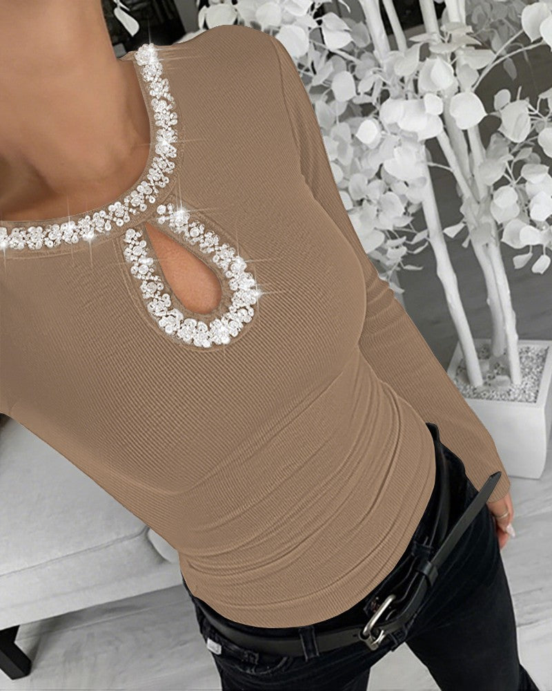 Rhinestone Decor Keyhole Neck Hollow Water Drop Ribbed Top Long Sleeve Slim Fit Layering Top