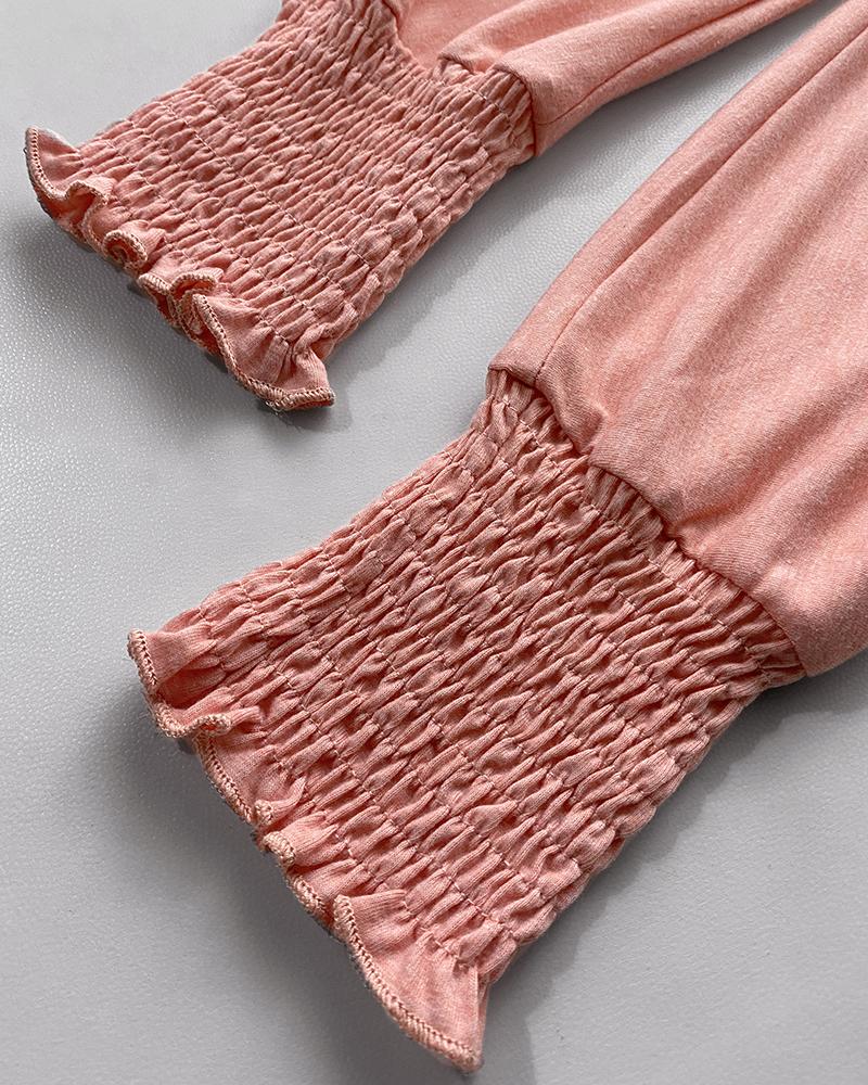 Round Neck Shirred Lantern Sleeve Long Sleeve Softy Basic T Shirt Casual Tee