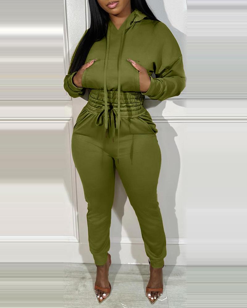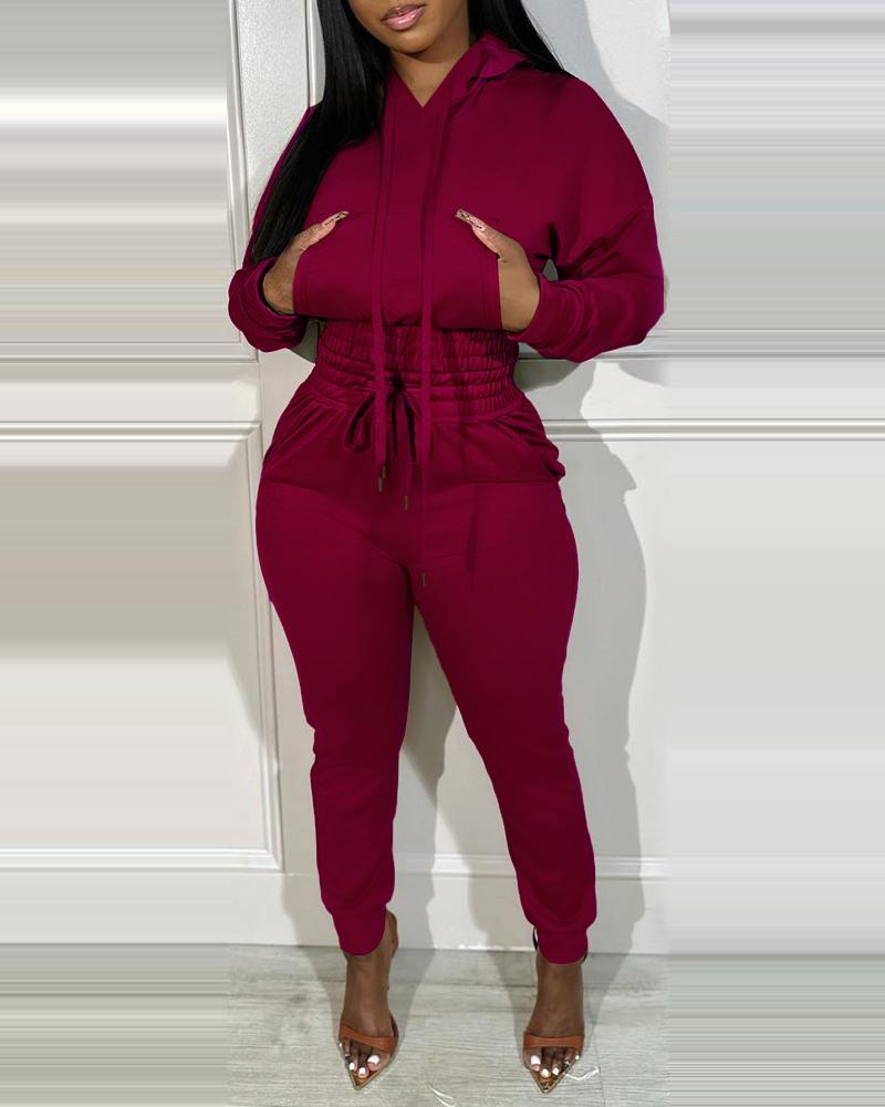 Shirred Pocket Design Crop Hoodie & High Waist Cuffed Sweatpants Set