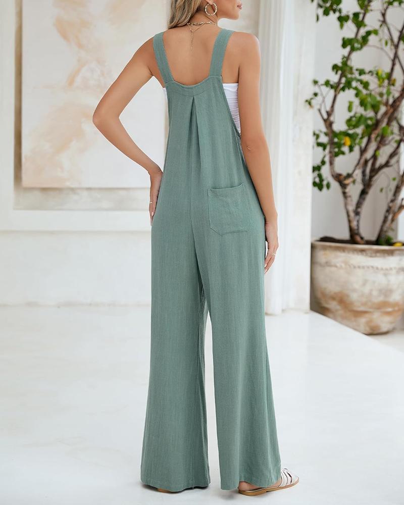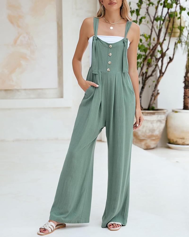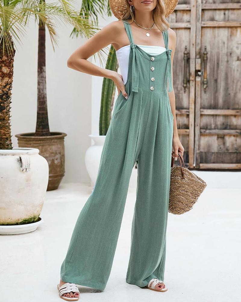 Tied Detail Pocket Design Button Front Jumpsuit Casual Wide Leg Overall